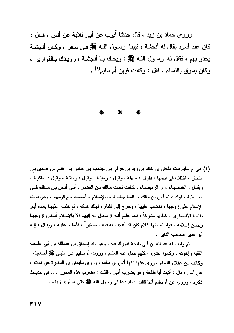 وروى حماد بن زيد، قال حدثنا أيوب عن أبى قلابة عن أنس، قال: كان عبد أسود يقال له أنجشة، فبينا رسول اللَّه صلّى اللَّه عليه وسلّم في سفر، وكان أنجشة يحدو بهم، فقال له رسول اللَّه صلّى اللَّه عليه وسلّم: ويحك يا أنجشة، رويدك بالقوارير،