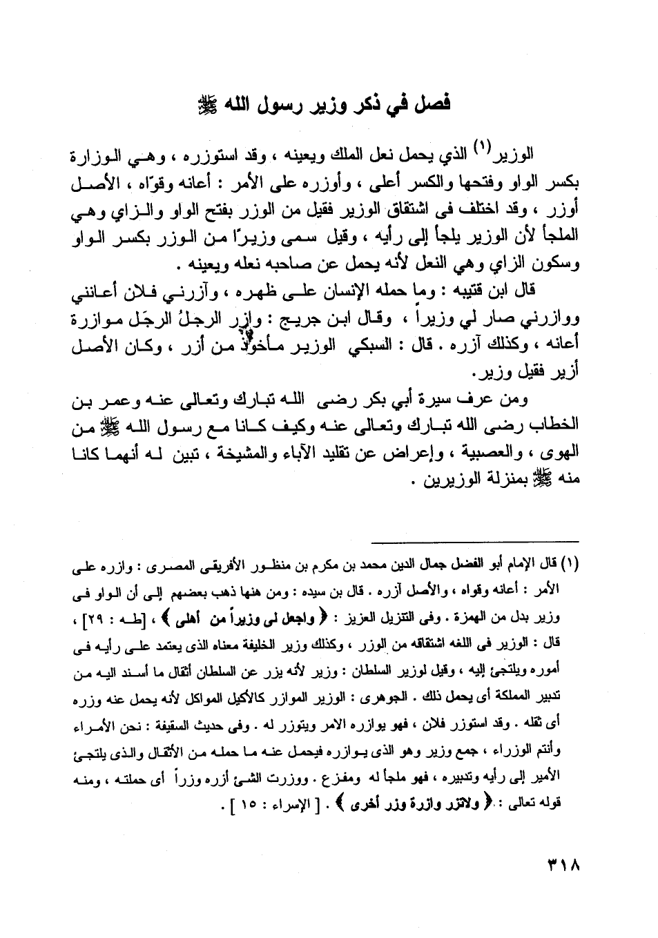 [ (1) ] قال الإمام أبو الفضل جمال الدين محمد بن مكرم بن منظور الإفريقي المصري: وازره على الأمر: أعانه وقواه، والأصل آزره. قال بن سيده: ومن هاهنا ذهب بعضهم إلى أن الواو في وزير بدل من الهمزة. وفي التنزيل العزيز: وَاجْعَلْ لِي وَزِيراً مِنْ أَهْلِي، [طه: 29] ، قال: الوزير في اللغة اشتقاقه من الوزر، وكذلك وزير الخليفة معناه الّذي يعتمد على رأيه في أموره ويلتجئ إليه، وقيل لوزير السلطان: وزير لأنه يزر عن السلطان أثقال ما أسند إليه من تدبير المملكة أي يحمل ذلك. الجوهري: الوزير الموازر كالأكيل المواكل لأنه يحمل عنه وزره أي ثقله. وقد استوزر فلان، فهو يوازره الأمر ويتوزر له. وفي حديث السقيفة: نحن الأمراء وأنتم الوزراء، جمع وزير وهو الّذي يوازره فيحمل عنه ما حمله من الأثقال والّذي يلتجئ الأمير إلى رأيه وتدبيره، فهو ملجأ له ومفزع. ووزرت الشيء أزره وزرا أي حملته، ومنه قوله تعالى: وَلا تَزِرُ وازِرَةٌ وِزْرَ أُخْرى. [الإسراء: 15] .