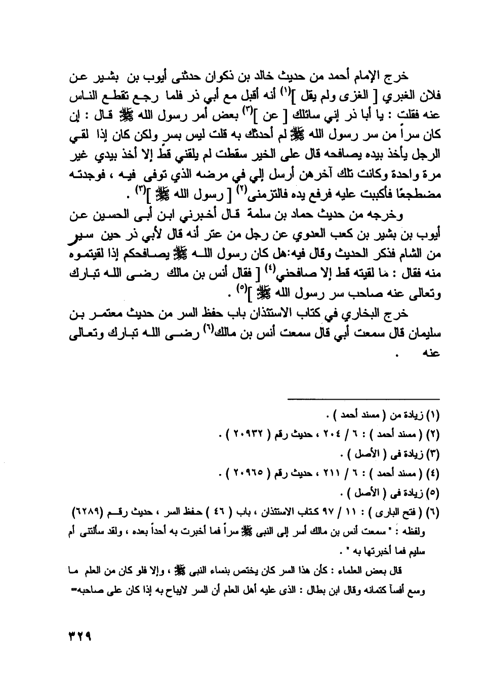[ (6) ] (فتح الباري) : 11/ 97 كتاب الاستئذان، باب (46) حفظ السر، حديث رقم (6289) ولفظه: «سمعت أنس بن مالك أسر إلى النبي صلّى اللَّه عليه وسلّم سرا فما أخبرت به أحدا بعده، ولقد سألتني أم سليم فما أخبرتها به» .