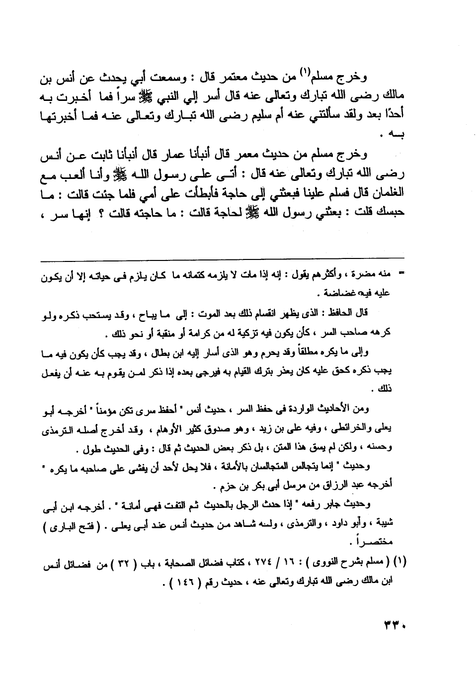 وخرج مسلم من حديث معمر قال أنبأنا عمار قال أنبأنا ثابت عن أنس رضى اللَّه تبارك وتعالى عنه قال: أتى على رسول اللَّه صلّى اللَّه عليه وسلّم وأنا ألعب مع الغلمان قال فسلم علينا فبعثني إلى حاجة فأبطأت على أمي فلما جئت قالت: ما حبسك قلت: بعثني رسول اللَّه صلّى اللَّه عليه وسلّم لحاجة قالت: ما حاجته قالت؟ إنها سر،