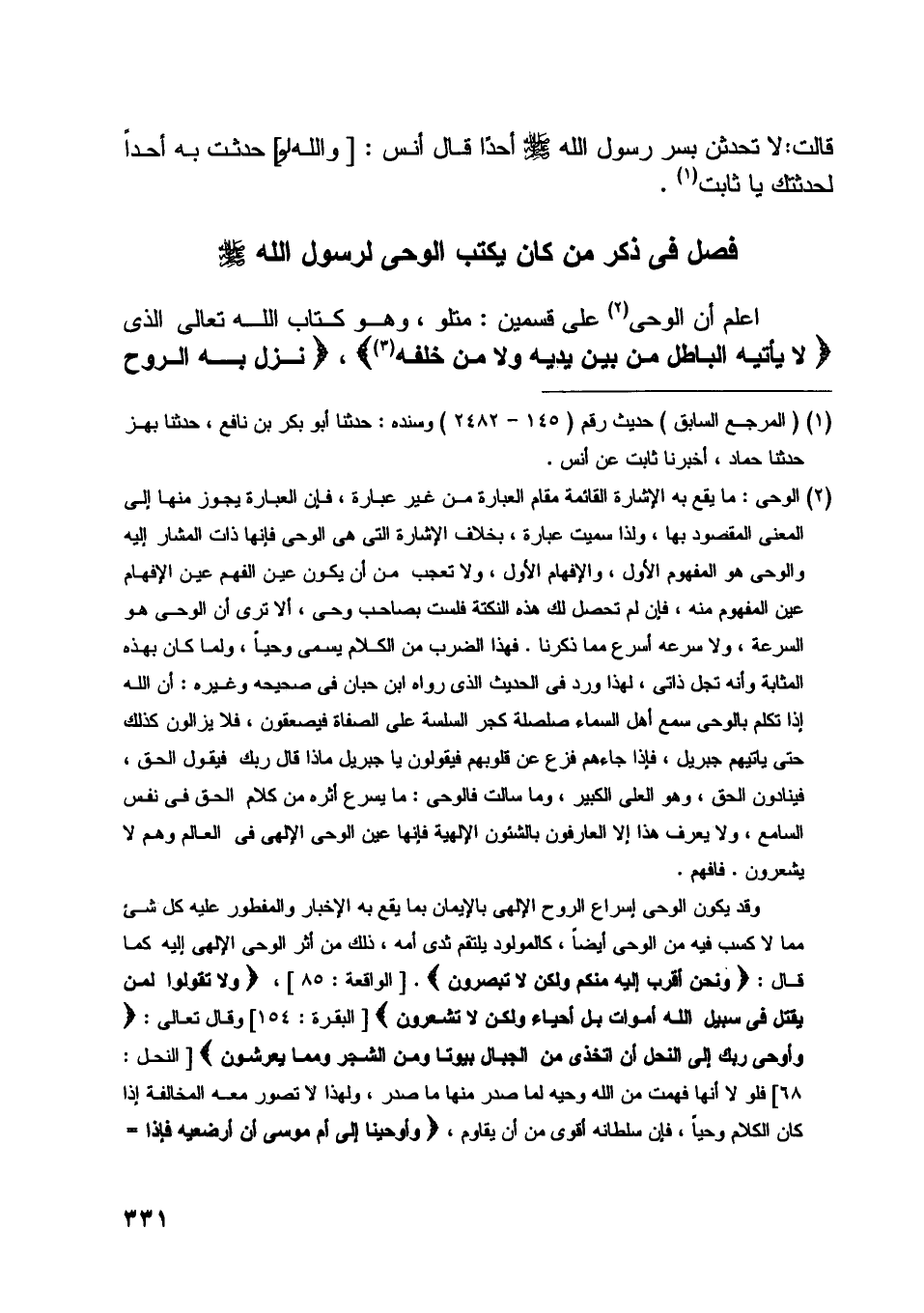 اعلم أن الوحي [ (2) ] على قسمين: متلو، وهو كتاب اللَّه تعالى الّذي لا يَأْتِيهِ الْباطِلُ مِنْ بَيْنِ يَدَيْهِ وَلا مِنْ خَلْفِهِ (فصلت: 42) ، نَزَلَ بِهِ الرُّوحُ