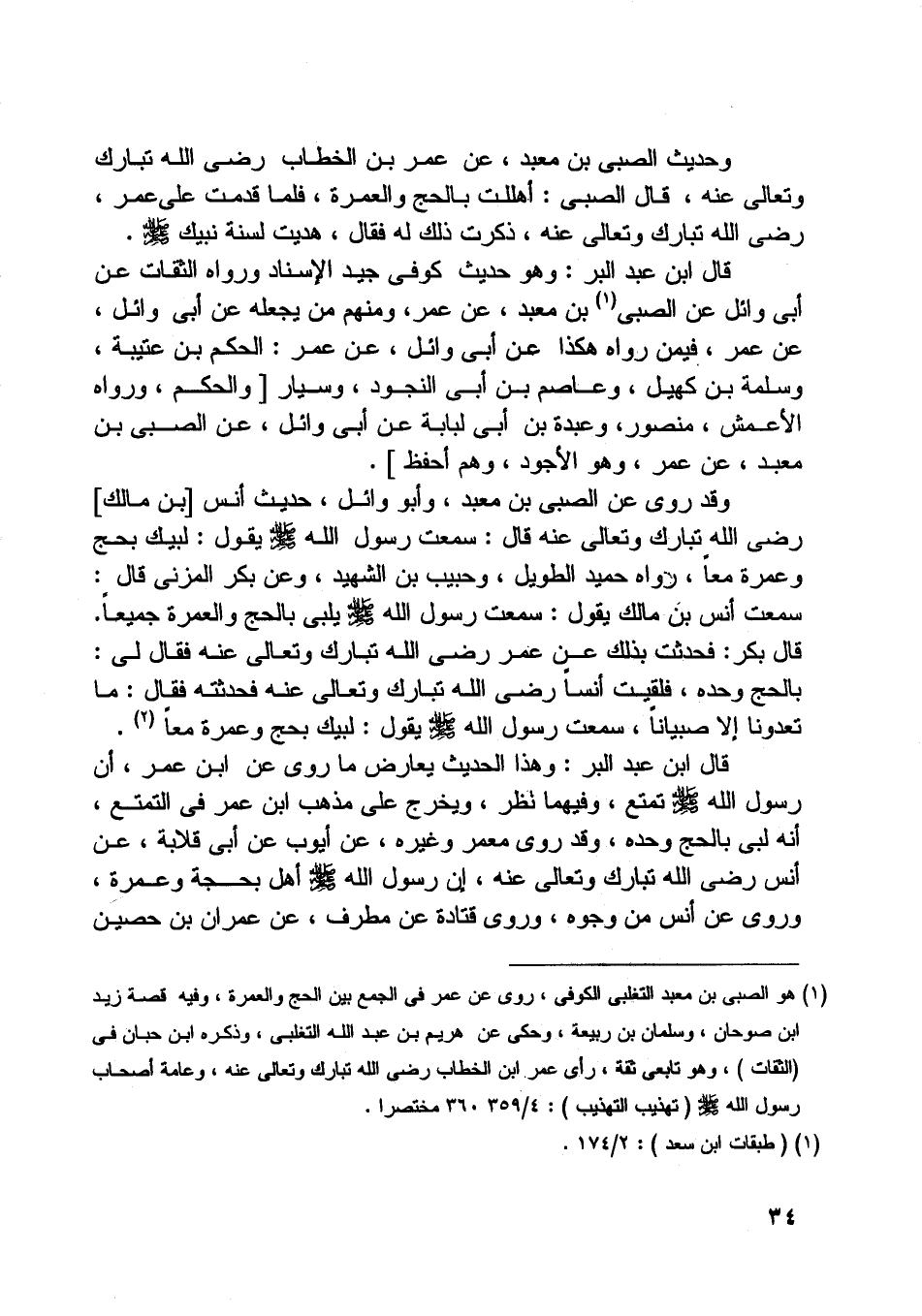 وحديث الصبى بن معبد، عن عمر بن الخطاب رضى اللَّه تبارك وتعالى عنه، قال الصبى: أهللت بالحج والعمرة، فلما قدمت على عمر، رضى اللَّه تبارك وتعالى عنه، ذكرت ذلك له فقال، هديت لسنة نبيك صلّى اللَّه عليه وسلّم.