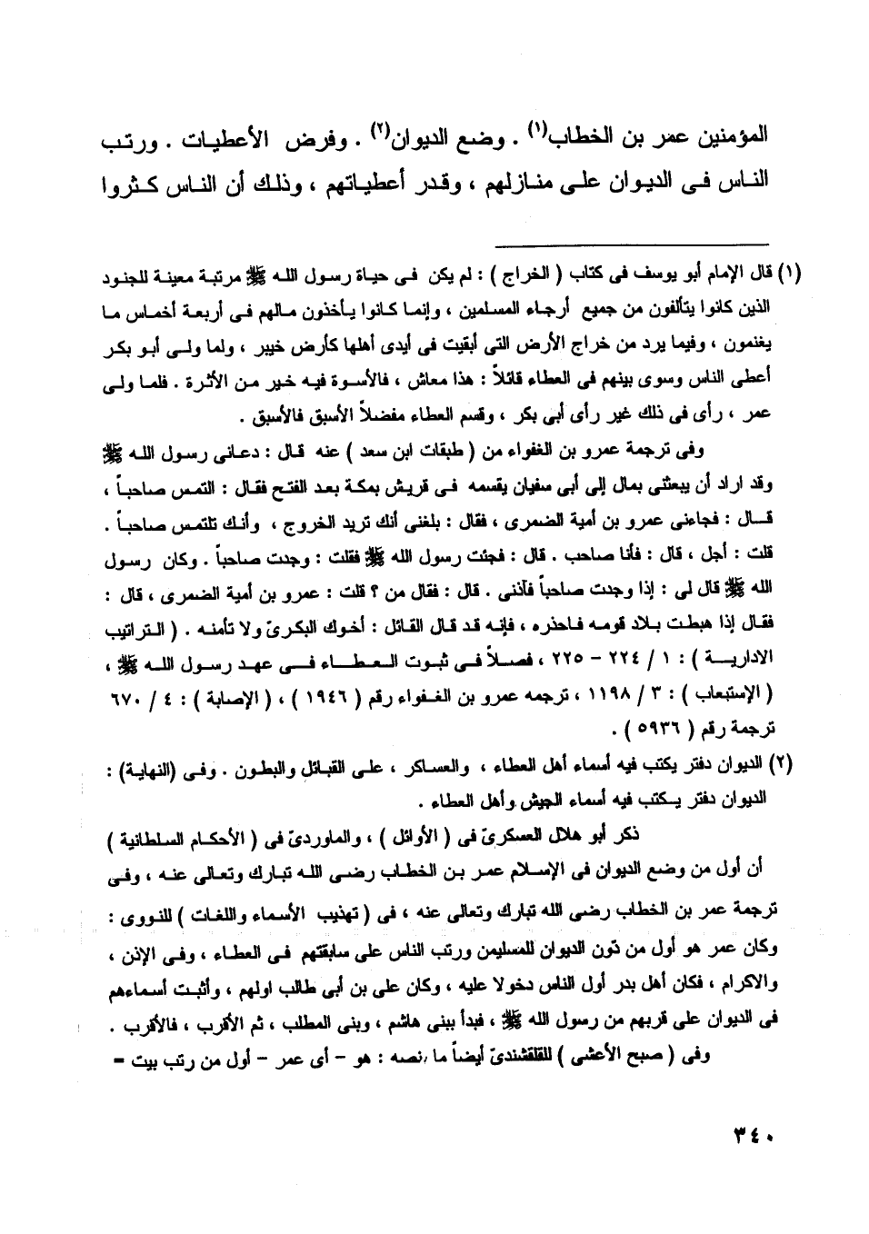 [ (1) ] قال الإمام أبو يوسف في كتاب (الخراج) : لم يكن في حياة رسول اللَّه صلّى اللَّه عليه وسلّم مرتبة معينة للجنود الذين كانوا يتألفون من جميع أرجاء المسلمين، وإنما كانوا يأخذون مالهم في أربعة أخماس ما يغنمون، وفيما يرد من خراج الأرض التي أبقيت في أيدي أهلها كأرض خيبر، ولما ولى أبو بكر أعطى الناس وسوى بينهم في العطاء قائلا: هذا معاش، فالأسوة فيه خير من الأثرة. فلما ولى عمر، رأى في ذلك غير رأى أبى بكر، وقسم العطاء مفضلا الأسبق فالأسبق.