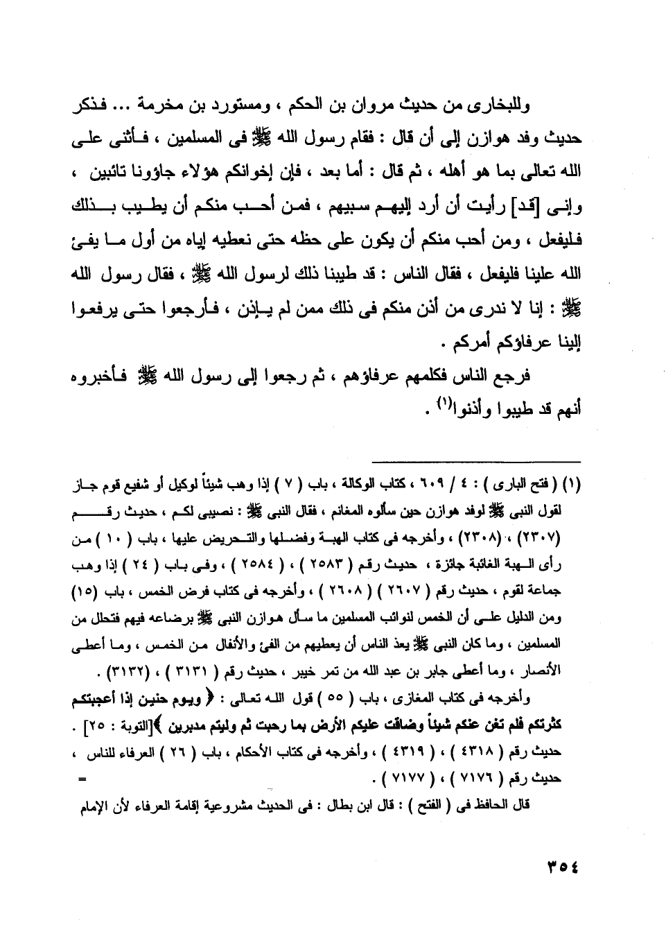 وللبخاريّ من حديث مروان بن الحكم، ومستورد بن مخرمة ... فذكر حديث وفد هوازن إلى أن قال: فقام رسول اللَّه صلّى اللَّه عليه وسلّم في المسلمين، فأثنى على اللَّه تعالى بما هو أهله، ثم قال: أما بعد، فإن إخوانكم هؤلاء جاءونا تائبين، وإني [قد] رأيت أن أراد إليهم سبيهم، فمن أحب منكم أن يطيب بذلك فليفعل، ومن أحب منكم أن يكون على حظه حتى نعطيه إياه من أول ما يفيء اللَّه علينا فليفعل، فقال الناس: قد طيبنا ذلك لرسول اللَّه صلّى اللَّه عليه وسلّم، فقال رسول اللَّه صلّى اللَّه عليه وسلّم: إنا لا ندري من أذن منكم في ذلك ممن لم يأذن، فأرجعوا حتى يرفعوا إلينا عرفاؤكم أمركم.