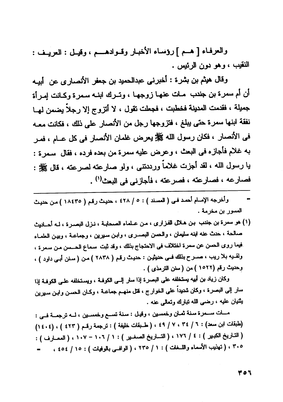 وقال هيثم بن بشرة: أخبرنى عبد الحميد بن جعفر الأنصاري عن أبيه أن أم سمرة بن جندب مات عنها زوجها، وترك ابنه سمرة وكانت امرأة جميلة، فقدمت المدينة فخطبت، فجعلت تقول، لا أتزوج إلا رجلا يضمن لها نفقة ابنها سمرة حتى يبلغ، فتزوجها رجل من الأنصار على ذلك، فكانت معه في الأنصار، فكان رسول اللَّه صلّى اللَّه عليه وسلّم يعرض غلمان الأنصار في كل عام، فمر به غلام فأجازه في البعث، وعرض عليه سمرة من بعده فرده، فقال سمرة: