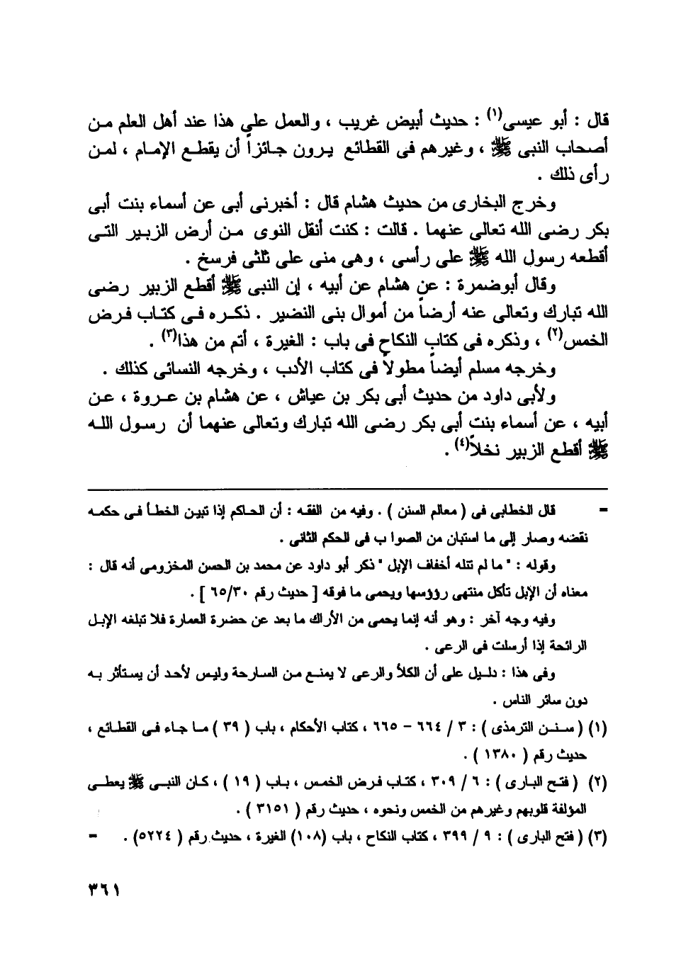 ولأبى داود من حديث أبى بكر بن عياش، عن هشام بن عروة، عن أبيه، عن أسماء بنت أبى بكر رضى اللَّه تبارك وتعالى عنهما أن رسول اللَّه صلّى اللَّه عليه وسلّم، أقطع الزبير نخلا [ (4) ] .