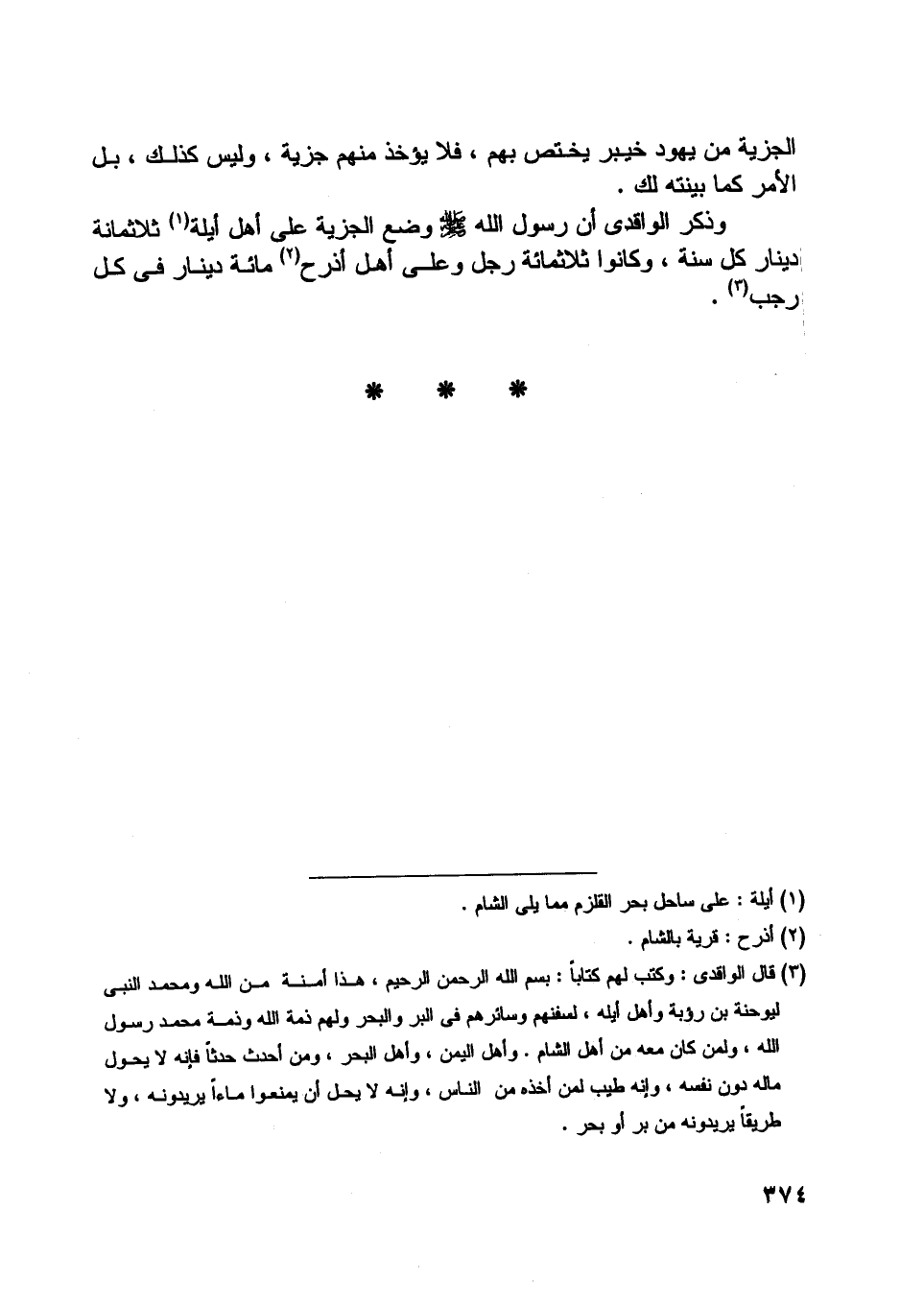 وذكر الواقدي أن رسول اللَّه صلّى اللَّه عليه وسلّم وضع الجزية على أهل أيلة [ (1) ] ثلاثمائة دينار كل سنة، وكانوا ثلاثمائة رجل وعلى أهل أذرح [ (2) ] مائة دينار في كل رجب [ (3) ] .