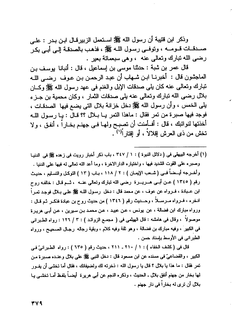 قال عمر بن شبة: حدثنا موسى بن إسماعيل، قال: أنبأنا يوسف بن الماجشون قال: أخبرنا ابن شهاب أن عبد الرحمن بن عوف رضى اللَّه تبارك وتعالى عنه كان يلي صدقات الإبل والغنم في عهد رسول اللَّه صلّى اللَّه عليه وسلّم وكان بلال رضى اللَّه تبارك وتعالى عنه يلي صدقات الثمار، وكان محمية بن جزء يلي الخمس، وأن رسول اللَّه صلّى اللَّه عليه وسلّم دخل خزانة بلال التي يضع فيها الصدقات، فوجد فيها صبرة من تمر فقال: ما هذا التمر يا بلال؟ قال: يا رسول اللَّه أخذتها لنوائبك، قال: أفأمنت أن تصبح ولها في جهنم بخارا، أنفق، ولا تخش من ذي العرش إقلالا، أو إقتارا [ (1) ] .