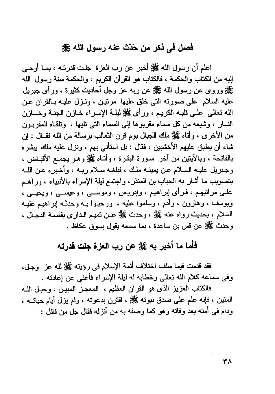 اعلم أن رسول اللَّه صلّى اللَّه عليه وسلّم أخبر عن رب العزة جلت قدرته، بما أوحى إليه من الكتاب والحكمة، فالكتاب هو القرآن الكريم، والحكمة سنة رسول اللَّه صلّى اللَّه عليه وسلّم وروى عن رسول اللَّه صلّى اللَّه عليه وسلّم عن ربه عز وجل أحاديث كثيرة، ورأى جبريل عليه السلام على صورته التي خلق عليها مرتين، ونزل عليه بالقرآن عن اللَّه تعالى على قلبه الكريم، ورأى صلّى اللَّه عليه وسلّم ليلة الإسراء خازن الجنة وخازن النار، وشيعه من كل سماء مقربوها إلى السماء التي تليها، وتلقاه المقربون من الأخرى، وأتاه صلّى اللَّه عليه وسلّم ملك الجبال يوم قرن الثعالب برسالة من اللَّه فقال: إن شاء أن يطبق عليهم الأخشبين، فقال: بل استأنى بهم، ونزل عليه ملك يبشره بالفاتحة، وبالآيتين من آخر سورة البقرة، وأتاه صلّى اللَّه عليه وسلّم وهو يجمع الأقباض، وجبريل عليه السلام عن يمينه ملك، فبلغه سلام ربه، وأخبره عن اللَّه بتصويب ما أشار به الحباب بن المنذر، واجتمع ليلة الإسراء بالأنبياء، ورآهم على مراتبهم، فرأى إبراهيم، وإدريس، وموسى، وعيسى، ويحيى، ويوسف، وهارون، وآدم، وسلموا عليه، ورحبوا به وحدثه إبراهيم عليه السلام، بحديث رواه عنه صلّى اللَّه عليه وسلّم، وحدث صلّى اللَّه عليه وسلّم عن تميم الداريّ بقصة الدجال، وحدث صلّى اللَّه عليه وسلّم عن قس بن ساعدة، بما سمعه يقول بسوق عكاظ.