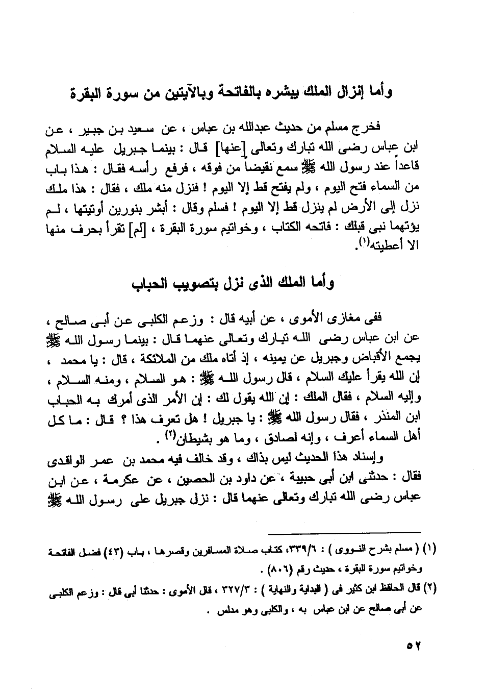 فخرج مسلم من حديث عبد اللَّه بن عباس، عن سعيد بن جبير، عن ابن عباس رضى اللَّه تبارك وتعالى [عنها] قال: بينما جبريل عليه السّلام قاعدا عند رسول اللَّه صلّى اللَّه عليه وسلّم سمع نقيضا من فوقه، فرفع رأسه فقال: هذا باب من السماء فتح اليوم، ولم يفتح قط إلا اليوم! فنزل منه ملك، فقال: هذا ملك نزل إلى الأرض لم ينزل قط إلا اليوم! فسلم وقال: أبشر بنورين أوتيتها، لم يؤتهما نبي قبلك: فاتحة الكتاب، وخواتيم سورة البقرة، [لم] تقرأ بحرف منها الا أعطيته [ (1) ] .