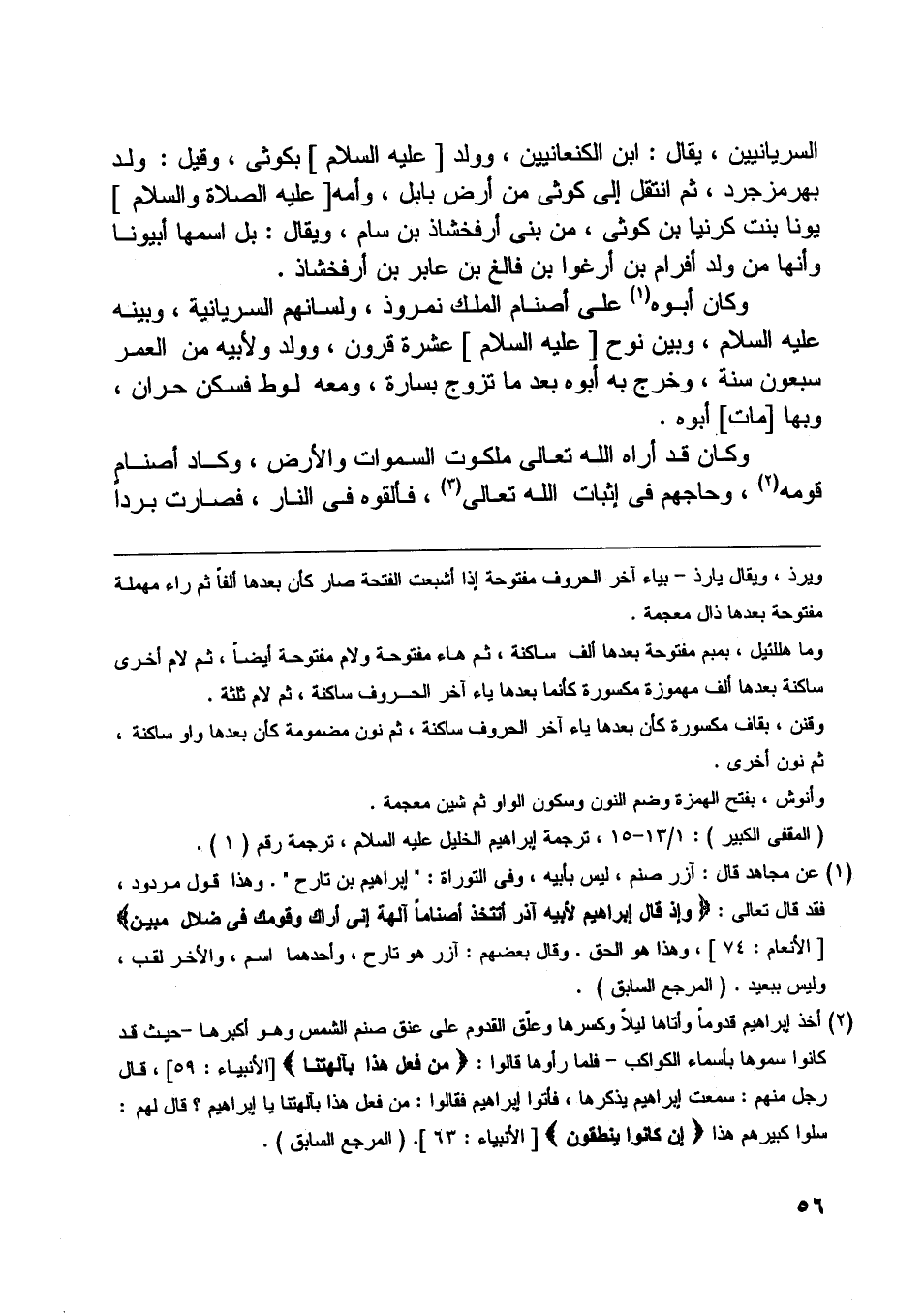 وكان أبوه [ (1) ] على أصنام الملك نمروذ، ولسانهم السريانية، وبينه عليه السّلام، وبين نوح [عليه السّلام] عشرة قرون، وولد ولأبيه من العمر سبعون سنة، وخرج به أبوه بعد ما تزوج بسارة، ومعه لوط فسكن حران، وبها [مات] أبوه.