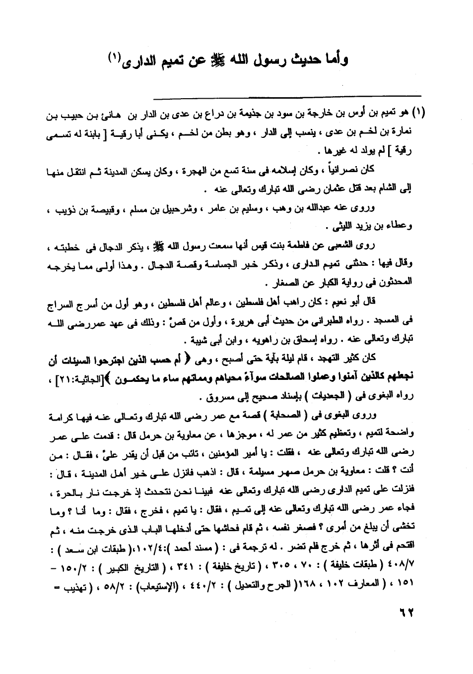[ (1) ] هو تميم بن أوس بن خارجة بن سود بن جذيمة بن دراع بن عدي بن الدار بن هانئ بن حبيب بن نمارة بن لخم بن عدي، ينسب إلى الدار، وهو بطن من لخم، يكنى أبا رقية [بابنة له تسمى رقية] لم يولد له غيرها.
