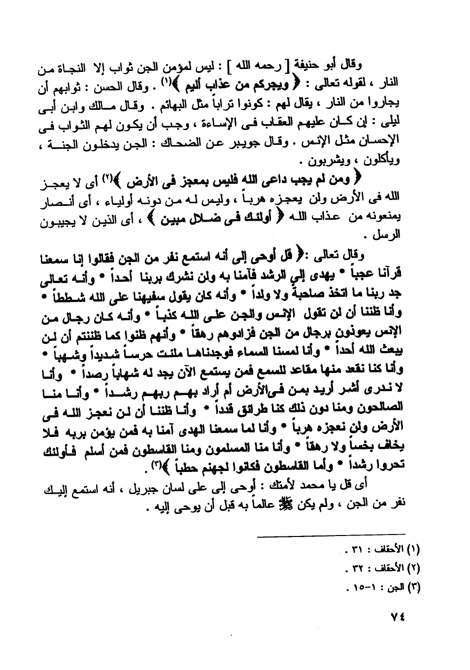 وقال تعالى: قُلْ أُوحِيَ إِلَيَّ أَنَّهُ اسْتَمَعَ نَفَرٌ مِنَ الْجِنِّ فَقالُوا إِنَّا سَمِعْنا قُرْآناً عَجَباً* يَهْدِي إِلَى الرُّشْدِ فَآمَنَّا بِهِ وَلَنْ نُشْرِكَ بِرَبِّنا أَحَداً* وَأَنَّهُ تَعالى جَدُّ رَبِّنا مَا اتَّخَذَ صاحِبَةً وَلا وَلَداً* وَأَنَّهُ كانَ يَقُولُ سَفِيهُنا عَلَى اللَّهِ شَطَطاً* وَأَنَّا ظَنَنَّا أَنْ لَنْ تَقُولَ الْإِنْسُ وَالْجِنُّ عَلَى اللَّهِ كَذِباً* وَأَنَّهُ كانَ رِجالٌ مِنَ الْإِنْسِ يَعُوذُونَ بِرِجالٍ مِنَ الْجِنِّ فَزادُوهُمْ رَهَقاً* وَأَنَّهُمْ ظَنُّوا كَما ظَنَنْتُمْ أَنْ لَنْ يَبْعَثَ اللَّهُ أَحَداً* وَأَنَّا لَمَسْنَا السَّماءَ فَوَجَدْناها مُلِئَتْ حَرَساً شَدِيداً وَشُهُباً* وَأَنَّا كُنَّا نَقْعُدُ مِنْها مَقاعِدَ لِلسَّمْعِ فَمَنْ يَسْتَمِعِ الْآنَ يَجِدْ لَهُ شِهاباً رَصَداً* وَأَنَّا لا نَدْرِي أَشَرٌّ أُرِيدَ بِمَنْ فِي الْأَرْضِ أَمْ أَرادَ بِهِمْ رَبُّهُمْ رَشَداً* وَأَنَّا مِنَّا الصَّالِحُونَ وَمِنَّا دُونَ ذلِكَ كُنَّا طَرائِقَ قِدَداً* وَأَنَّا ظَنَنَّا أَنْ لَنْ نُعْجِزَ اللَّهَ فِي الْأَرْضِ وَلَنْ نُعْجِزَهُ هَرَباً* وَأَنَّا لَمَّا سَمِعْنَا الْهُدى آمَنَّا بِهِ فَمَنْ يُؤْمِنْ بِرَبِّهِ فَلا يَخافُ بَخْساً وَلا رَهَقاً* وَأَنَّا مِنَّا الْمُسْلِمُونَ وَمِنَّا الْقاسِطُونَ فَمَنْ أَسْلَمَ فَأُولئِكَ تَحَرَّوْا رَشَداً* وَأَمَّا الْقاسِطُونَ فَكانُوا لِجَهَنَّمَ حَطَباً