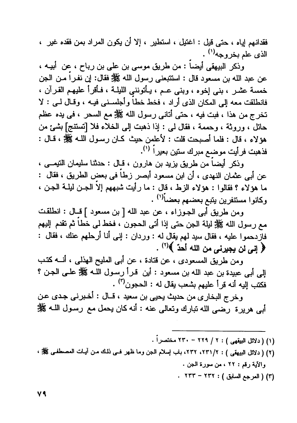 [ (2) ] (دلائل البيهقي) : 2/ 231، 232، باب إسلام الجن وما ظهر في ذلك من آيات المصطفى صلّى اللَّه عليه وسلّم، والآية رقم: 22، من سورة الجن.