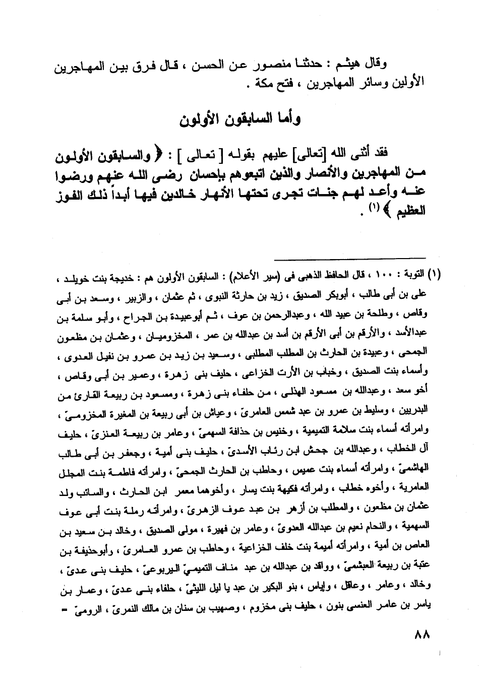 [ (1) ] التوبة: 100، قال الحافظ الذهبي في (سير الأعلام) : السابقون الأولون هم: خديجة بنت خويلد، على بن أبى طالب، أبو بكر الصديق، زيد بن حارثة النبوي، ثم عثمان، والزبير، وسعد بن أبى وقاص، وطلحة بن عبيد اللَّه، وعبد الرحمن بن عوف، ثم أبو عبيدة بن الجراح، وأبو سلمة بن عبد الأسد، والأرقم بن أبى الأرقم بن أسد بن عبد اللَّه بن عمر، المخزوميان، وعثمان بن مظعون الجمحيّ، وعبيدة بن الحارث بن المطلب المطلبي، وسعيد بن زيد بن عمرو بن نفيل العدوي، وأسماء بنت الصديق، وخباب بن الأرت الخزاعي، حليف بنى زهرة، وعمير بن أبى وقاص، أخو سعد، وعبد اللَّه بن مسعود الهذلي، من حلفاء بنى زهرة، ومسعود بن ربيعة القارئ من البدريين، وسليط بن عمرو بن عبد شمس العامرىّ، وعياش بن أبى ربيعة بن المغيرة المخزوميّ، وامرأته أسماء بنت سلامة التميمة، وخنيس بن حذافة السهمىّ، وعامر بن ربيعة العنزىّ، حليف آل الخطاب، وعبد اللَّه بن جحش ابن رئاب الأسديّ، حليف بنى أمية، وجعفر بن أبى طالب الهاشميّ، وامرأته أسماء بنت عميس، وحاطب بن الحارث الجمحيّ، وامرأته فاطمة بنت المجلل العامرية، وأخوه خطاب، وامرأته فكيهة بنت يسار، وأخوهما معمر ابن الحارث، والسائب ولد عثمان بن مظعون، والمطلب بن أزهر بن عبد عوف الزهرىّ، وامرأته رملة بنت أبى عوف السهمية، والنحام نعيم بن عبد اللَّه العدوىّ، وعامر بن فهيرة، مولى الصديق، وخالد بن سعيد بن العاص بن أمية، وامرأته أميمة بنت خلف الخزاعية، وحاطب بن عمرو العامرىّ، وأبو حذيفة بن عتبة بن ربيعة العبشمىّ، وواقد بن عبد اللَّه بن عبد مناف التميميّ اليربوعىّ، حليف بنى عدىّ، وخالد، وعامر، وعاقل، وإياس، بنو البكير بن عبد يا ليل الليثىّ، حلفاء بنى عدىّ، وعمار بن ياسر بن عامر العنسيّ بنون، حليف بنى مخزوم، وصهيب بن سنان بن مالك النمرىّ، الرومىّ