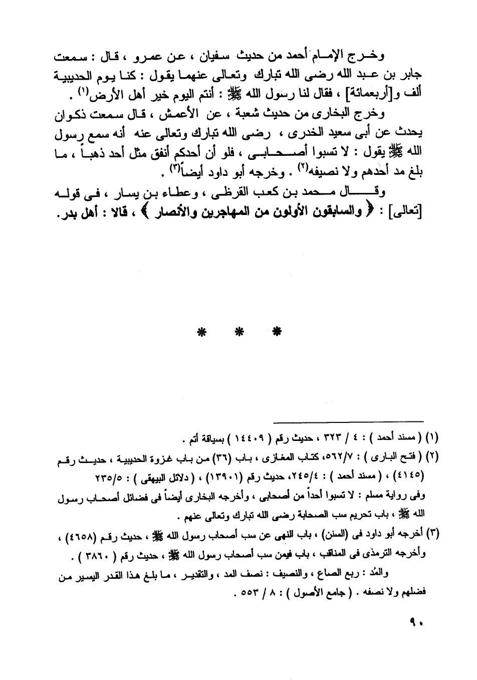 [ (2) ] (فتح الباري) : 7/ 562، كتاب المغازي، باب (36) من باب غزوة الحديبيّة، حديث رقم (4145) ، (مسند أحمد) : 4/ 245، حديث رقم (13901) ، (دلائل البيهقي) : 5/ 235 وفي رواية مسلم: لا تسبوا أحدا من أصحابى، وأخرجه البخاري أيضا في فضائل أصحاب رسول اللَّه صلّى اللَّه عليه وسلّم، باب تحريم سب الصحابة رضى اللَّه تبارك وتعالى عنهم.