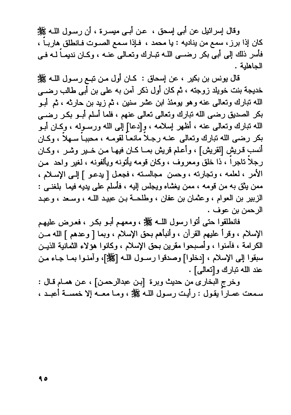 فانطلقوا حتى أتوا رسول اللَّه صلّى اللَّه عليه وسلّم، ومعهم أبو بكر، فعرض عليهم الإسلام، وقرأ عليهم القرآن، وأنبأهم بحق الإسلام، وبما [وعدهم] اللَّه من الكرامة، فآمنوا، وأصبحوا مقرين بحق الإسلام، وكانوا هؤلاء الثمانية الذين سبقوا إلى الإسلام، [دخلوا] وصدقوا رسول اللَّه [صلّى اللَّه عليه وسلّم] ، وآمنوا بما جاء من عند اللَّه تبارك و [تعالى] .