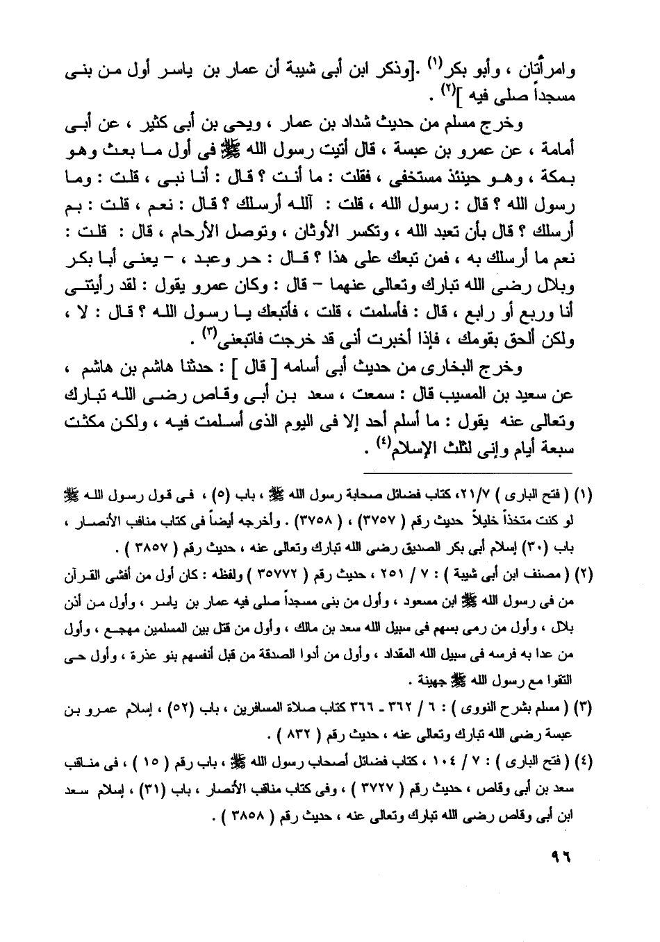 [ (4) ] (فتح الباري) : 7/ 104، كتاب فضائل أصحاب رسول اللَّه صلّى اللَّه عليه وسلّم، باب رقم (15) ، في مناقب سعد بن أبى وقاص، حديث رقم (3727) ، وفي كتاب مناقب الأنصار، باب (31) ، إسلام سعد ابن أبى وقاص رضى اللَّه تبارك وتعالى عنه، حديث رقم (3858) .