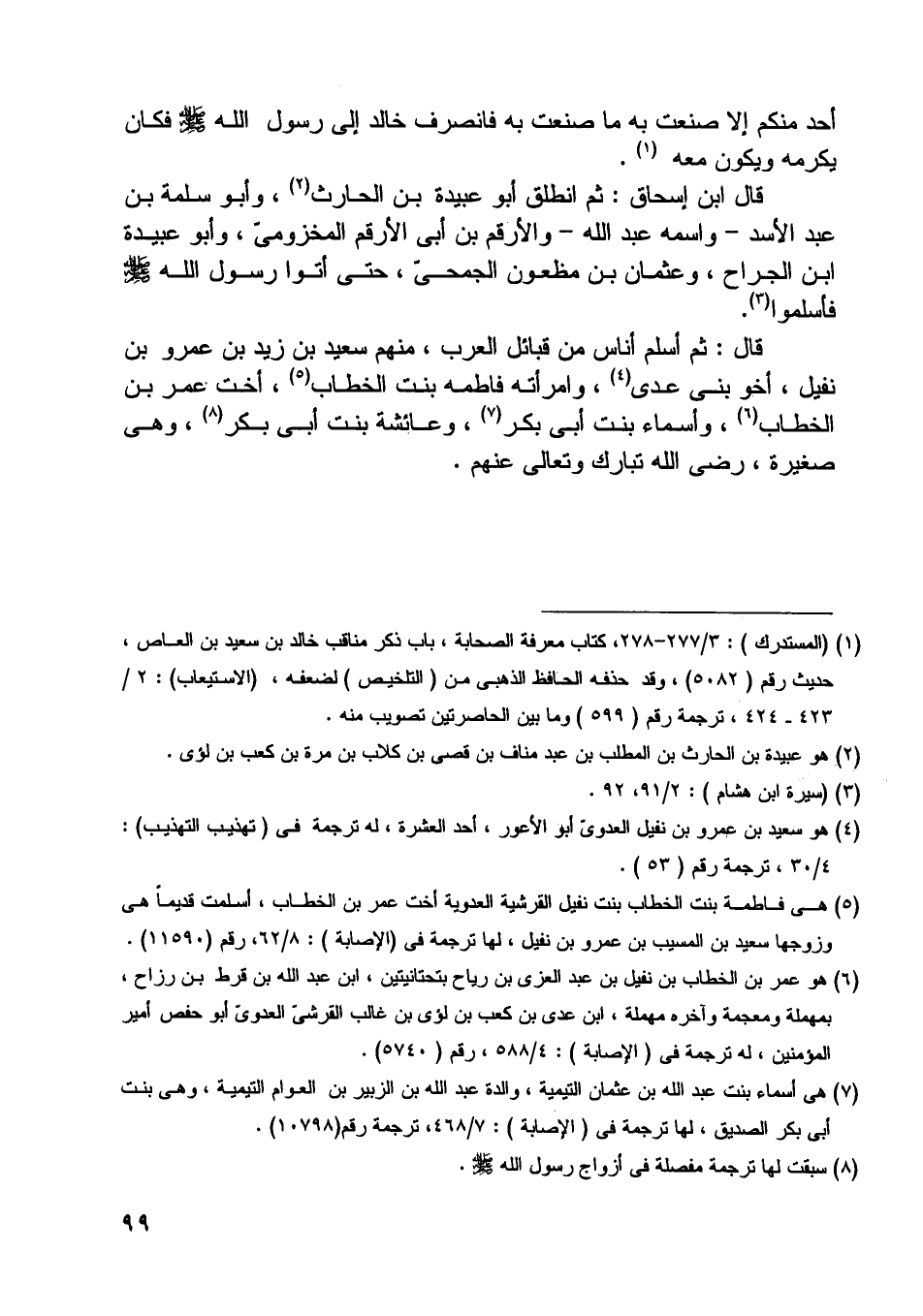 [ (1) ] (المستدرك) : 3/ 277- 278، كتاب معرفة الصحابة، باب ذكر مناقب خالد بن سعيد بن العاص، حديث رقم (5082) ، وقد حذفه الحافظ الذهبي من (التلخيص) لضعفه، (الاستيعاب) : 2/ 423- 424، ترجمة رقم (599) وما بين الحاصرتين تصويب منه.
