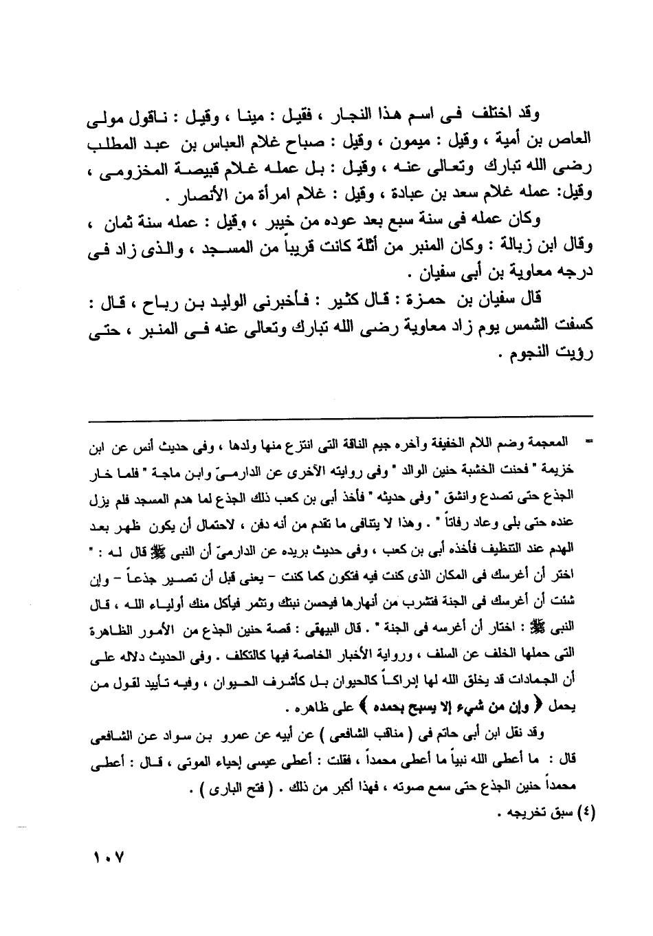 قال البيهقي: قصة حنين الجذع من الأمور الظاهرة التي حملها الخلف عن السلف، ورواية الأخبار الخاصة فيها كالتكلف. وفي الحديث دلالة على أن الجمادات قد يخلق اللَّه لها إدراكا كالحيوان بل كأشرف الحيوان، وفيه تأييد لقول من يحمل وَإِنْ مِنْ شَيْءٍ إِلَّا يُسَبِّحُ بِحَمْدِهِ على ظاهره.
