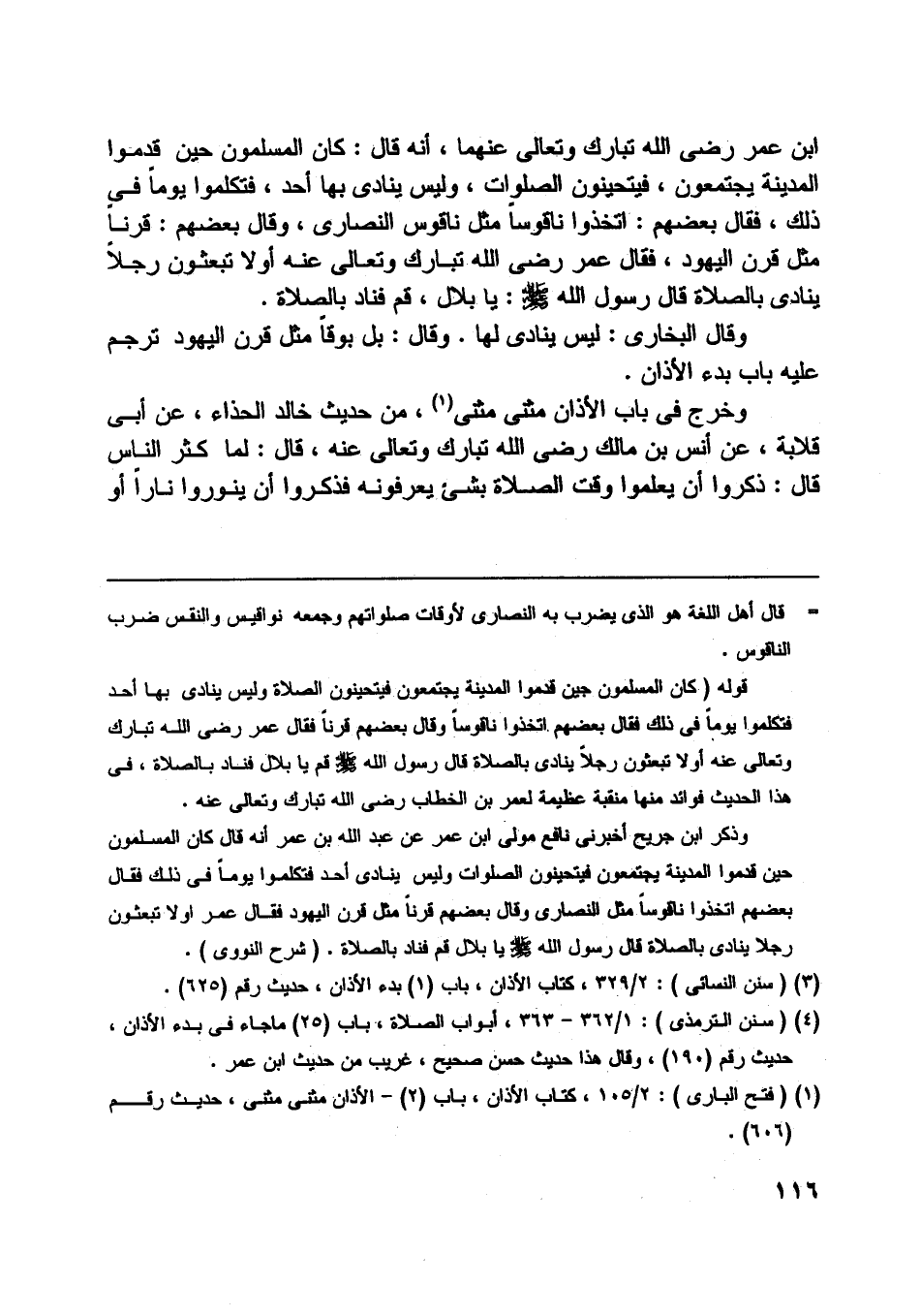 ابن عمر رضى اللَّه تبارك وتعالى عنهما، أنه قال: كان المسلمون حين قدموا المدينة يجتمعون، فيتحينون الصلوات، وليس ينادى بها أحد، فتكلموا يوما في ذلك، فقال بعضهم: اتخذوا ناقوسا مثل ناقوس النصارى، وقال بعضهم: قرنا مثل قرن اليهود، فقال عمر رضى اللَّه تبارك وتعالى عنه أولا تبعثون رجلا ينادى بالصلاة قال رسول اللَّه صلى اللَّه عليه وسلّم: يا بلال، قم فناد بالصلاة.