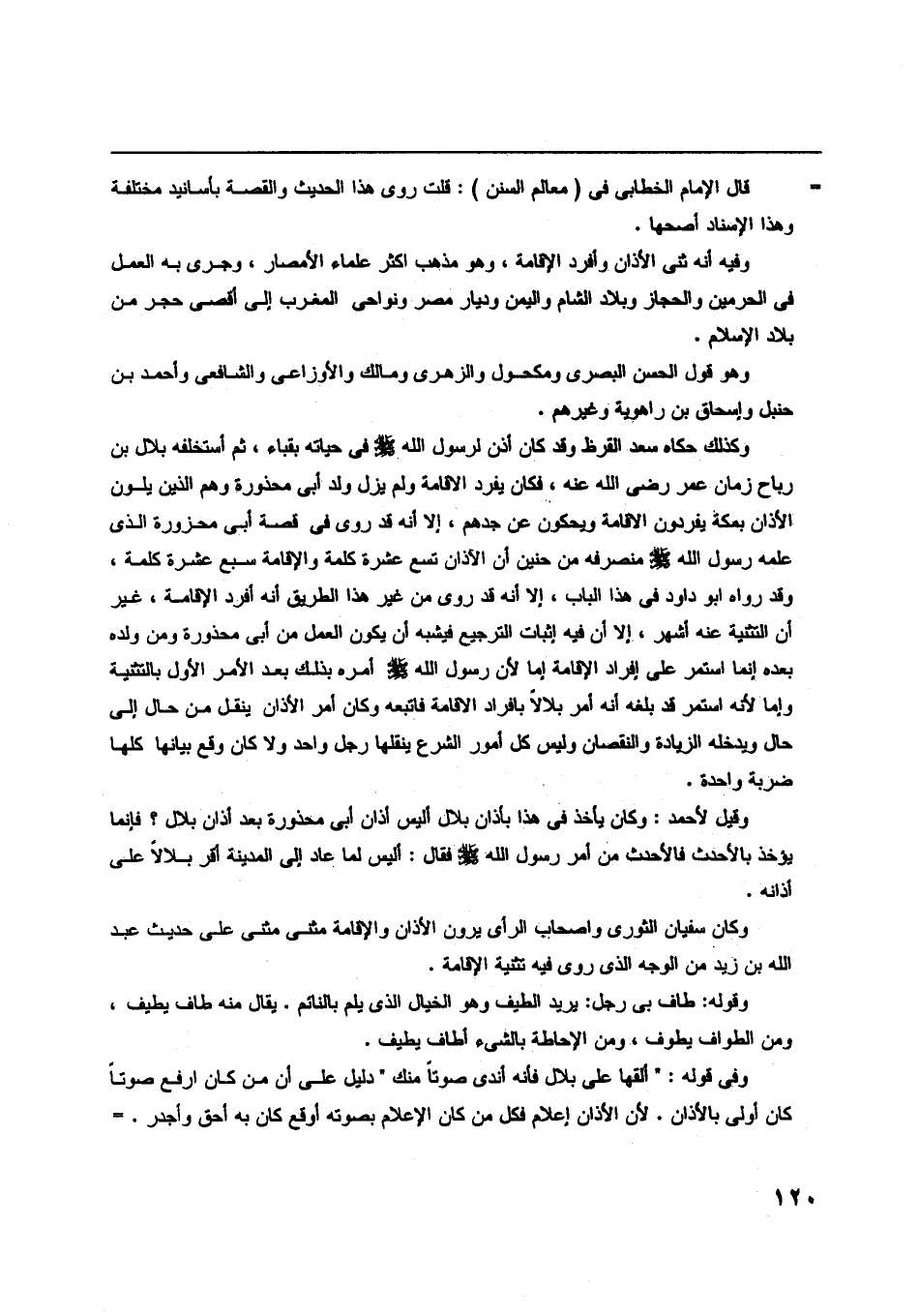 وفيه أنه ثنى الأذان وأفرد الإقامة، وهو مذهب أكثر علماء الأمصار، وجرى به العمل في الحرمين والحجاز وبلاد الشام واليمن وديار مصر ونواحي المغرب إلى أقصى حجر من بلاد الإسلام.