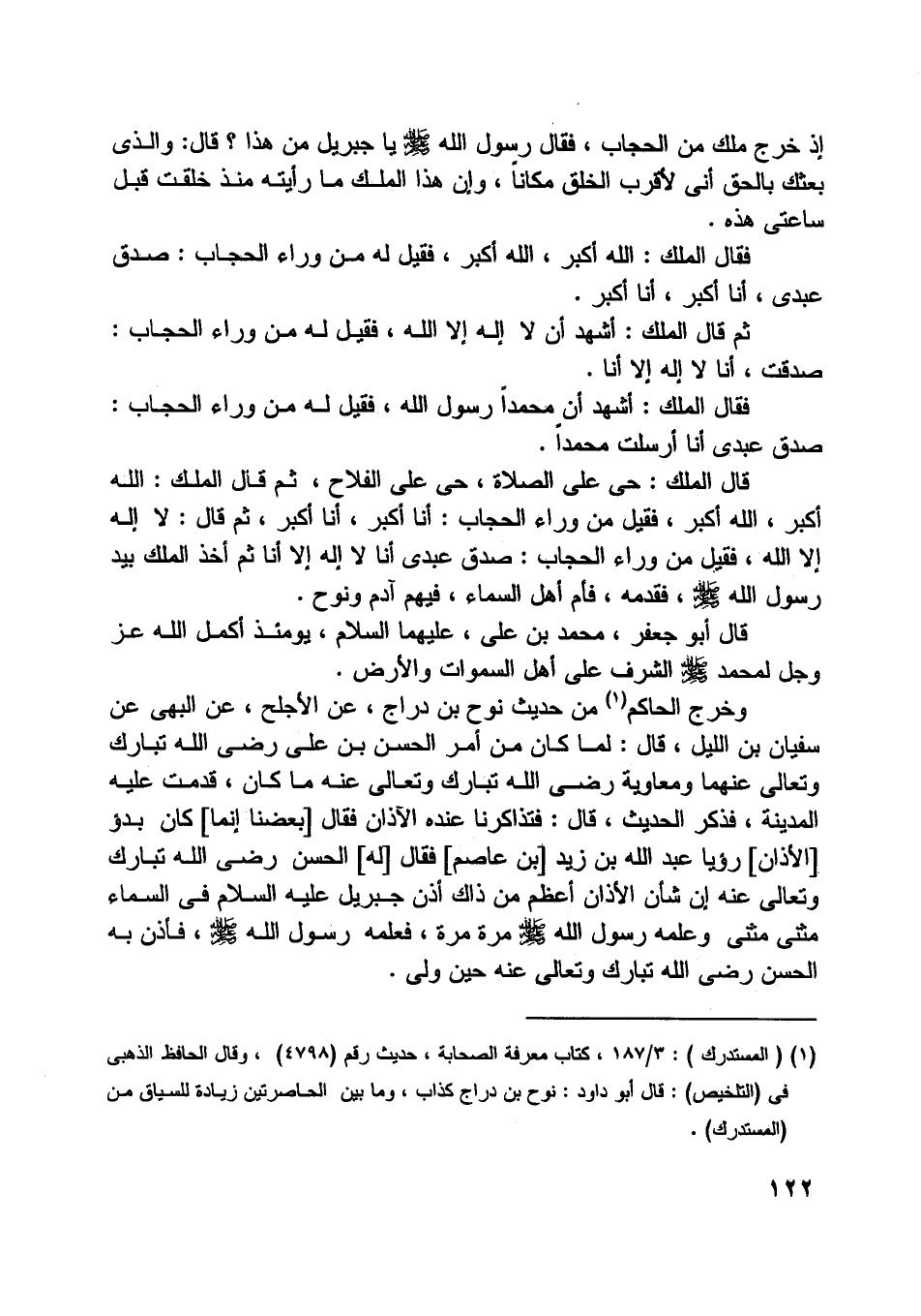 وخرج الحاكم [ (1) ] من حديث نوح بن دراج، عن الأجلح، عن البهي عن سفيان بن الليل، قال: لما كان من أمر الحسن بن على رضى اللَّه تبارك وتعالى عنهما ومعاوية رضى اللَّه تبارك وتعالى عنه ما كان، قدمت عليه المدينة، فذكر الحديث، قال: فتذاكرنا عنده الآذان فقال [بعضنا إنما] كان بدؤ [الأذان] رؤيا عبد اللَّه بن زيد [بن عاصم] فقال [له] الحسن رضى اللَّه تبارك وتعالى عنه إن شأن الأذان أعظم من ذاك أذن جبريل عليه السلام في السماء مثنى مثنى وعلمه رسول اللَّه صلى اللَّه عليه وسلّم مرة مرة، فعلمه رسول اللَّه صلى اللَّه عليه وسلّم، فأذن به الحسن رضى اللَّه تبارك وتعالى عنه حين ولى.