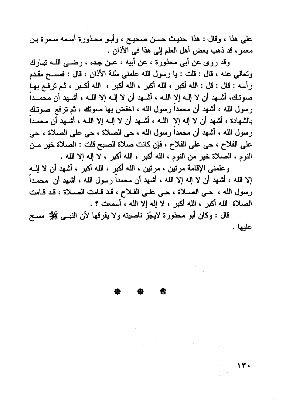 وقد روى عن أبى محذورة، عن أبيه، عن جده، رضى اللَّه تبارك وتعالى عنه، قال: قلت: يا رسول اللَّه علمني سنة الأذان، قال: فمسح مقدم رأسه: قال: قل: اللَّه أكبر، اللَّه أكبر، اللَّه أكبر، اللَّه أكبر، ثم ترفع بها صوتك، أشهد أن لا إله إلا اللَّه، أشهد أن لا إله إلا اللَّه، أشهد أن محمدا رسول اللَّه، أشهد أن لا إله إلا اللَّه، أشهد أن لا إله إلا اللَّه، أشهد أن محمدا رسول اللَّه، أشهد أن محمدا رسول اللَّه، اخفض بها صوتك، ثم ترفع صوتك بالشهادة، أشهد أن لا إله إلا اللَّه، أشهد أن لا إله إلا اللَّه، أشهد أن محمدا رسول اللَّه، أشهد أن محمدا رسول اللَّه، حي الصلاة، حي على الصلاة، حي على الفلاح، حي على الفلاح، فإن كانت صلاة الصبح قلت: الصلاة خير من النوم، الصلاة خير من النوم، اللَّه أكبر، اللَّه أكبر، لا إله إلا اللَّه.