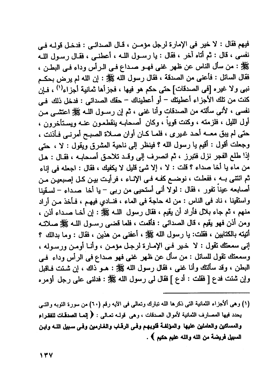 إني سمعتك تقول: لا خير في الإمارة لرجل مؤمن، وأنا أومن ورسوله، وسمعتك تقول للسائل: من سأل عن ظهر غنى فهو صداع في الرأس وداء في البطن، وقد سألتك وأنا غنى، فقال رسول اللَّه صلى اللَّه عليه وسلّم: هو ذاك، إن شئت فاقبل وإن شئت فدع [فقلت: أدع] فقال لي رسول اللَّه صلى اللَّه عليه وسلّم: فدلني على رجل أؤمره