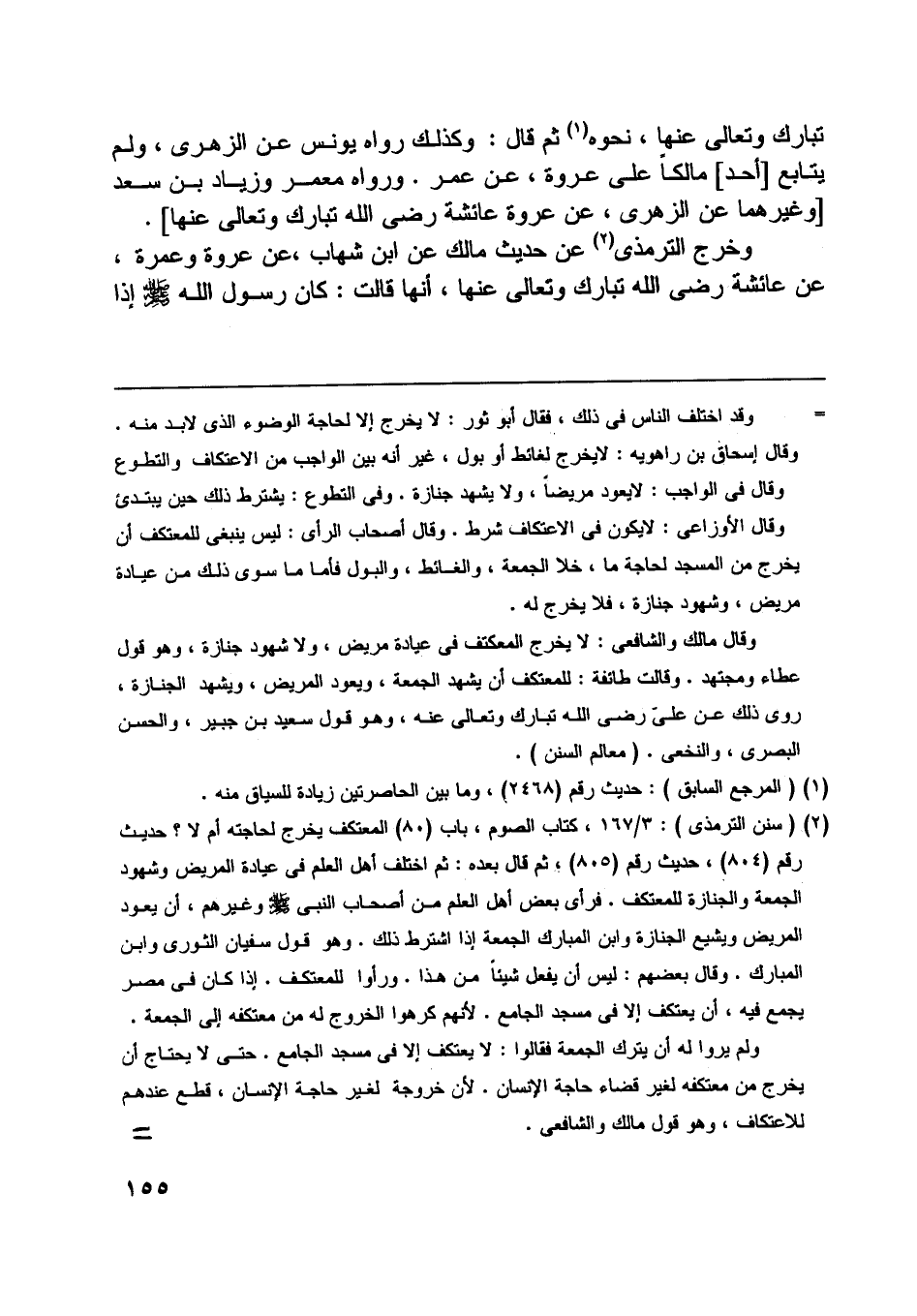 [ (2) ] (سنن الترمذي) : 3/ 167، كتاب الصوم، باب (80) المعتكف يخرج لحاجته أم لا؟ حديث رقم (804) ، حديث رقم (805) ، ثم قال بعده: ثم اختلف أهل العلم في عيادة المريض وشهود الجمعة والجنازة للمعتكف. فرأى بعض أهل العلم من أصحاب النبي صلى اللَّه عليه وسلّم وغيرهم، أن يعود المريض ويشيع الجنازة وابن المبارك الجمعة إذا اشترط ذلك. وهو قول سفيان الثوري وابن المبارك. وقال بعضهم: ليس أن يفعل شيئا من هذا. ورأوا للمعتكف. إذا كان في مصر يجمع فيه، أن يعتكف إلا في مسجد الجامع. لأنهم كرهوا الخروج له من معتكفه إلى الجمعة.