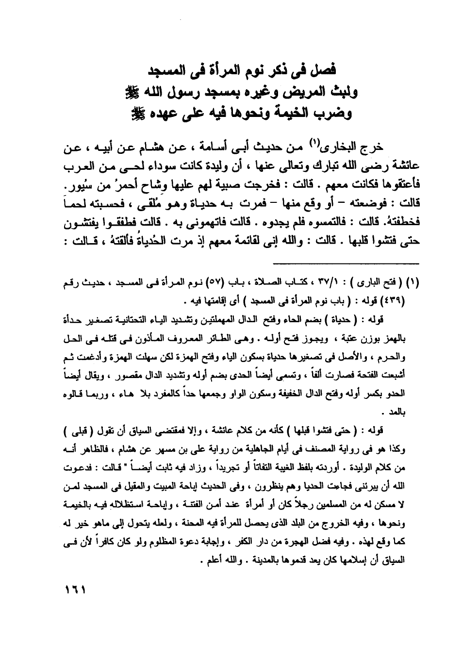 [ (1) ] (فتح الباري) : 1/ 37، كتاب الصلاة، باب (57) نوم المرأة في المسجد، حديث رقم (439) قوله: (باب نوم المرأة في المسجد) أي إقامتها فيه.