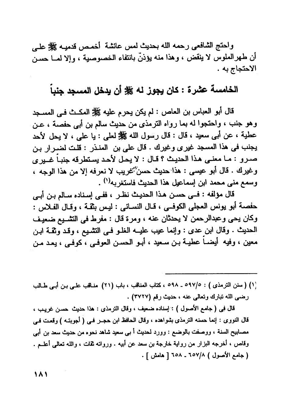 رواه الترمذي من حديث سالم بن أبى حفصة، عن عطية، عن أبى سعيد، قال: قال رسول اللَّه صلى اللَّه عليه وسلّم لعلى: يا على، لا يحل لأحد يجنب في هذا المسجد غيري وغيرك.