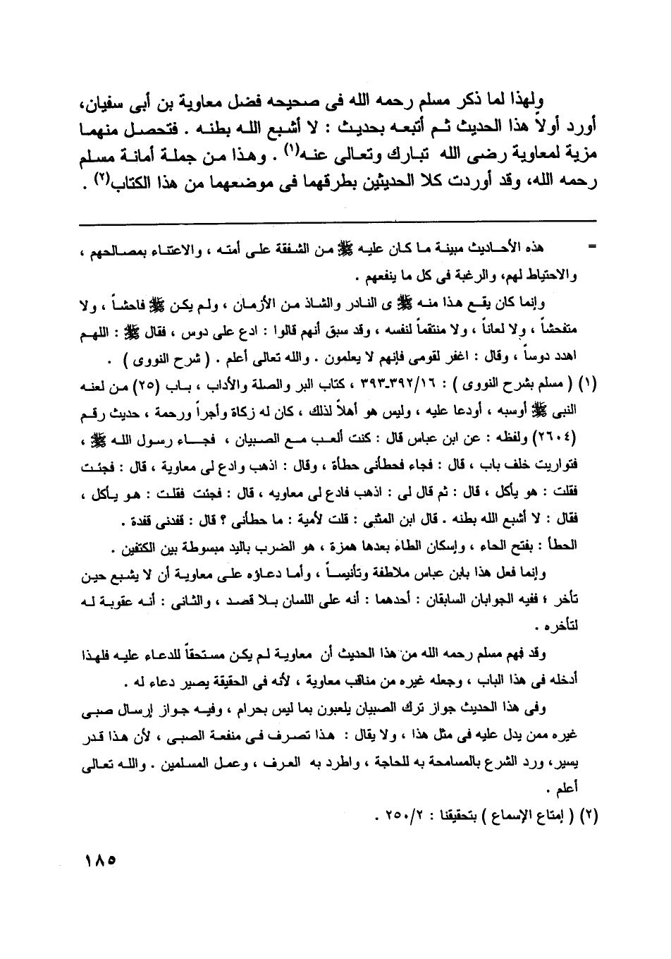 فتحصل منهما مزية لمعاوية رضى اللَّه تبارك وتعالى عنه [ (1) ] . وهذا من جملة أمانة مسلم رحمه اللَّه، وقد أوردت كلا الحديثين بطرقهما في موضعهما من هذا الكتاب [ (2) ] .