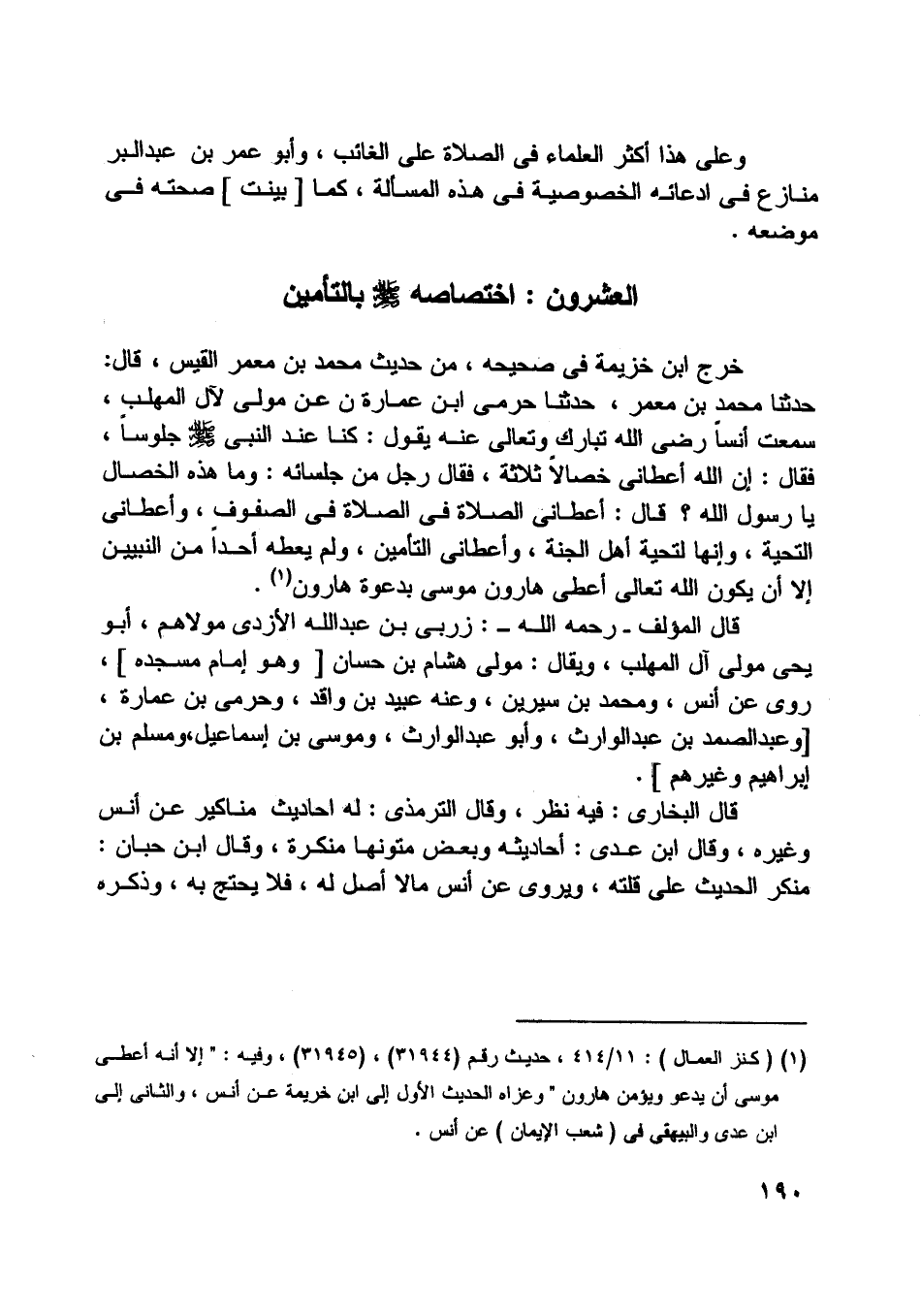حدثنا محمد بن معمر، حدثنا حرمي ابن عمارة عن مولى لآل المهلب، سمعت أنسا رضى اللَّه تبارك وتعالى عنه يقول: كنا عند النبي صلى اللَّه عليه وسلّم جلوسا، فقال: إن اللَّه أعطانى خصالا ثلاثة، فقال رجل من جلسائه: ومن هذه الخصال يا رسول اللَّه؟ قال: أعطانى الصلاة في الصلاة في الصفوف، وأعطانى التحية، وإنها لتحية أهل الجنة، وأعطانى التأمين، ولم يعطه أحدا من النبيين إلا أن يكون اللَّه تعالى أعطى هارون موسى بدعوة هارون [ (1) ] .