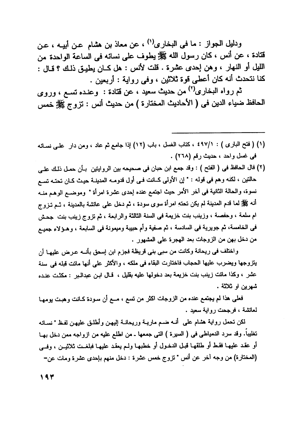 [ (2) ] قال الحافظ في (الفتح) : وقد جمع ابن حبان في صحيحه بين الروايتين بأن حمل ذلك على حالتين، لكنه وهم في قوله: «إن الأولى كانت في أول قدومه المدينة حيث كان تحته تسع نسوة، والحالة الثانية في آخر الأمر حيث اجتمع عنده إحدى عشرة امرأة» وموضع الوهم منه أنه صلى اللَّه عليه وسلّم لما قدم المدينة لم يكن تحته امرأة سوى سودة، ثم دخل على عائشة بالمدينة، ثم تزوج أم سلمة، وحفصة، وزينب بنت خزيمة في السنة الثالثة والرابعة، ثم تزوج زينب بنت جحش في الخامسة، ثم جويرية في السادسة، ثم صفية وأم حبيبة وميمونة في السابعة، وهؤلاء جميع من دخل بهن من الزوجات بعد الهجرة على المشهور.