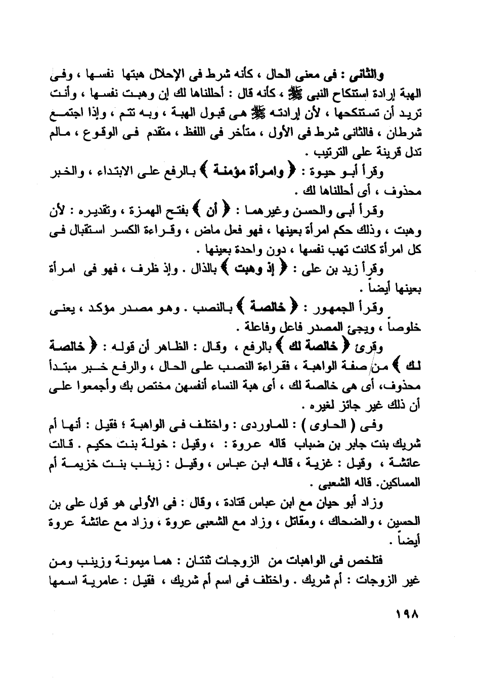 والثاني: في معنى الحال، كأنه شرط في الإحلال هبتها نفسها، وفي الهبة إرادة استنكاح النبي صلى اللَّه عليه وسلّم، كأنه قال: أحللناها لك إن وهبت نفسها، وأنت تريد أن تستنكحها، لأن إرادته صلى اللَّه عليه وسلّم هي قبول الهبة، وبه تتم، وإذا اجتمع شرطان، فالثاني شرط في الأول، متأخر في اللفظ، متقدم في الوقوع، ما لم تدل قرينة على الترتيب.