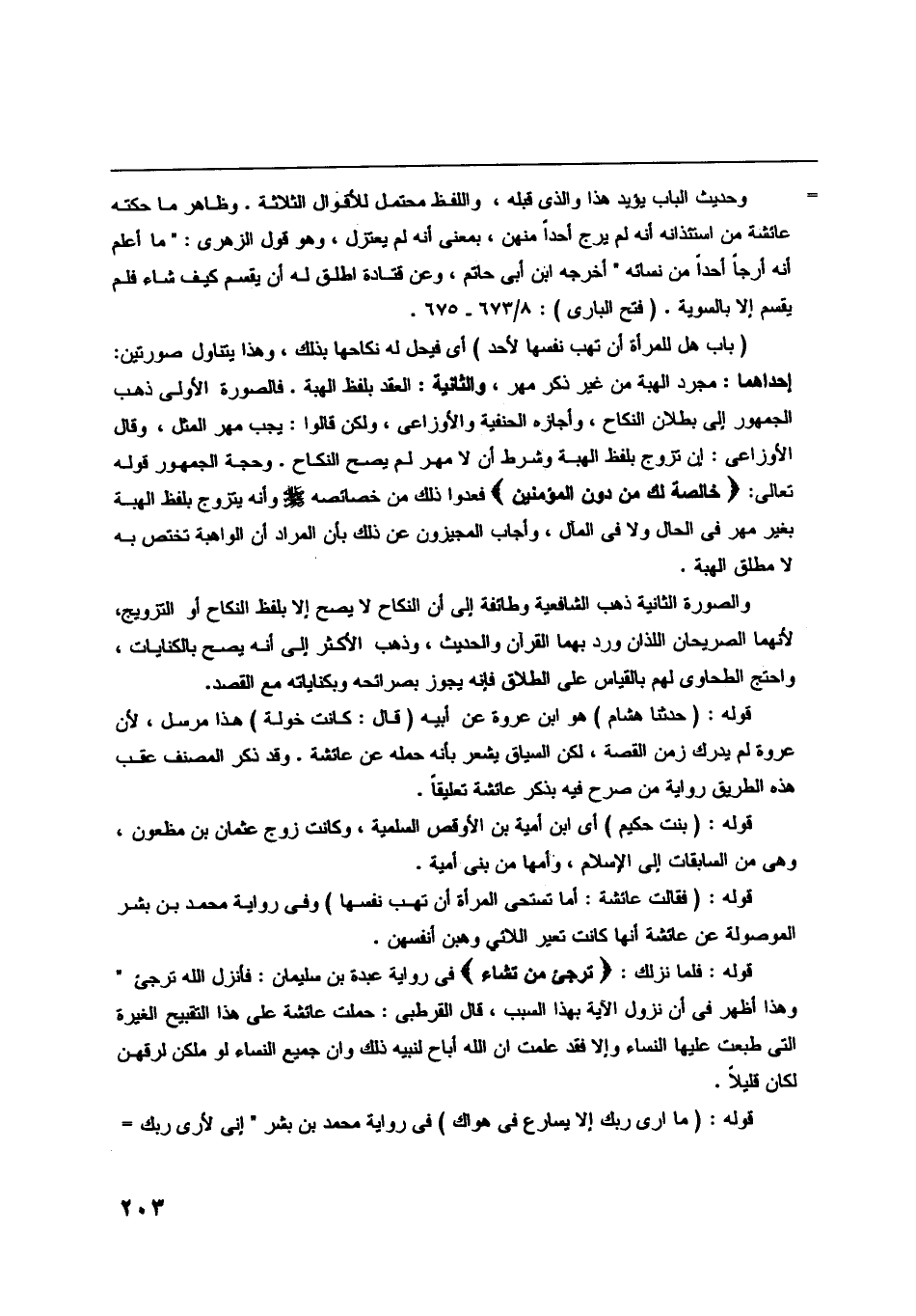 إحداهما: مجرد الهبة من غير ذكر مهر، والثانية: العقد بلفظ الهبة. فالصورة الأولى ذهب الجمهور إلى بطلان النكاح، وأجازه الحنفية والأوزاعي، ولكن قالوا: يجب مهر المثل، وقال الأوزاعي: إن تزوج بلفظ الهبة وشرط أن لا مهر لم يصح النكاح. وحجة الجمهور قوله تعالى: خالِصَةً لَكَ مِنْ دُونِ الْمُؤْمِنِينَ فعدوا ذلك من خصائصه صلى اللَّه عليه وسلّم وأنه يتزوج بلفظ الهبة بغير مهر في الحال ولا في المآل، وأجاب المجيزون عن ذلك بأن المراد أن الواهبة تختص به لا مطلق الهبة.