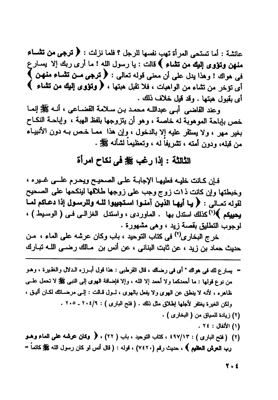 وعند القاضي أبى عبد اللَّه محمد بن سلامة القضاعي، أنه صلى اللَّه عليه وسلّم إنما خص بإباحة الموهوبة له خاصة، وهو أن يتزوجها بلفظ الهبة، وإباحة النكاح بغير مهر، ولا يستقر عليه إلا بالدخول، وإن هذا مما خص به دون الأنبياء من قبله، ودون أمته، تشريفا له، وتعظيما لشأنه صلى اللَّه عليه وسلّم.