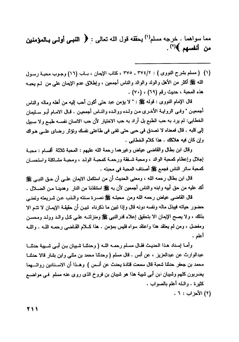 [ (1) ] (مسلم بشرح النووي) : 2/ 374- 375، كتاب الإيمان، باب (16) وجوب محبة رسول اللَّه صلى اللَّه عليه وسلّم أكثر من الأهل والولد والوالد والناس أجمعين، وإطلاق عدم الإيمان على من لم يحبه هذه المحبة، حديث رقم (69) ، (70) .