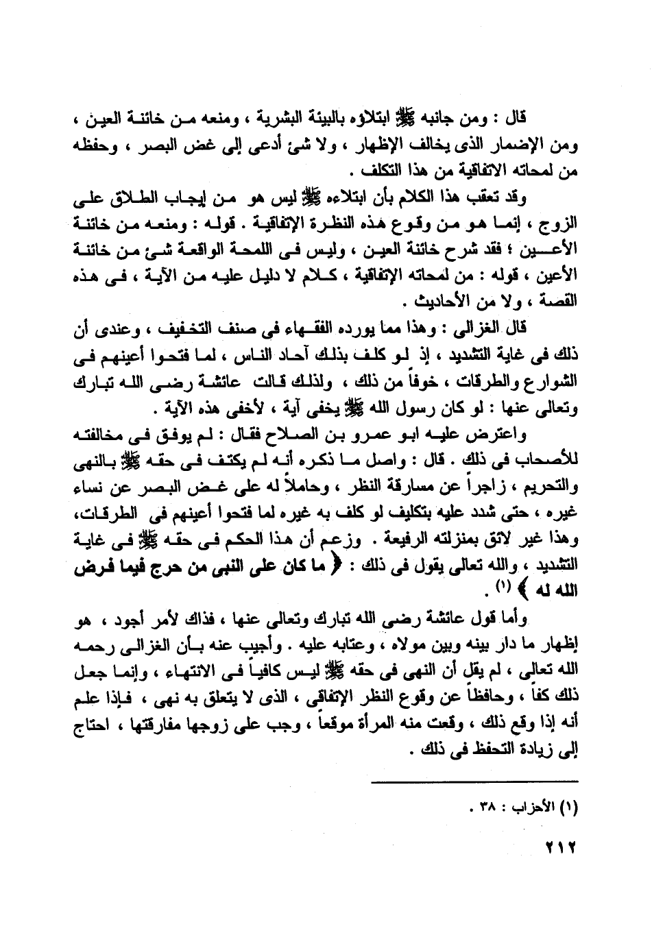 قال الغزالي: وهذا مما يورده الفقهاء في صنف التخفيف، وعندي أن ذلك في غاية التشديد، إذ لو كلف بذلك آحاد الناس، لما فتحوا أعينهم في الشوارع والطرقات، خوفا من ذلك، وذلك قالت عائشة رضى اللَّه تبارك وتعالى عنها: لو كان رسول اللَّه صلى اللَّه عليه وسلّم يخفى آية، لأخفى هذه الآية.
