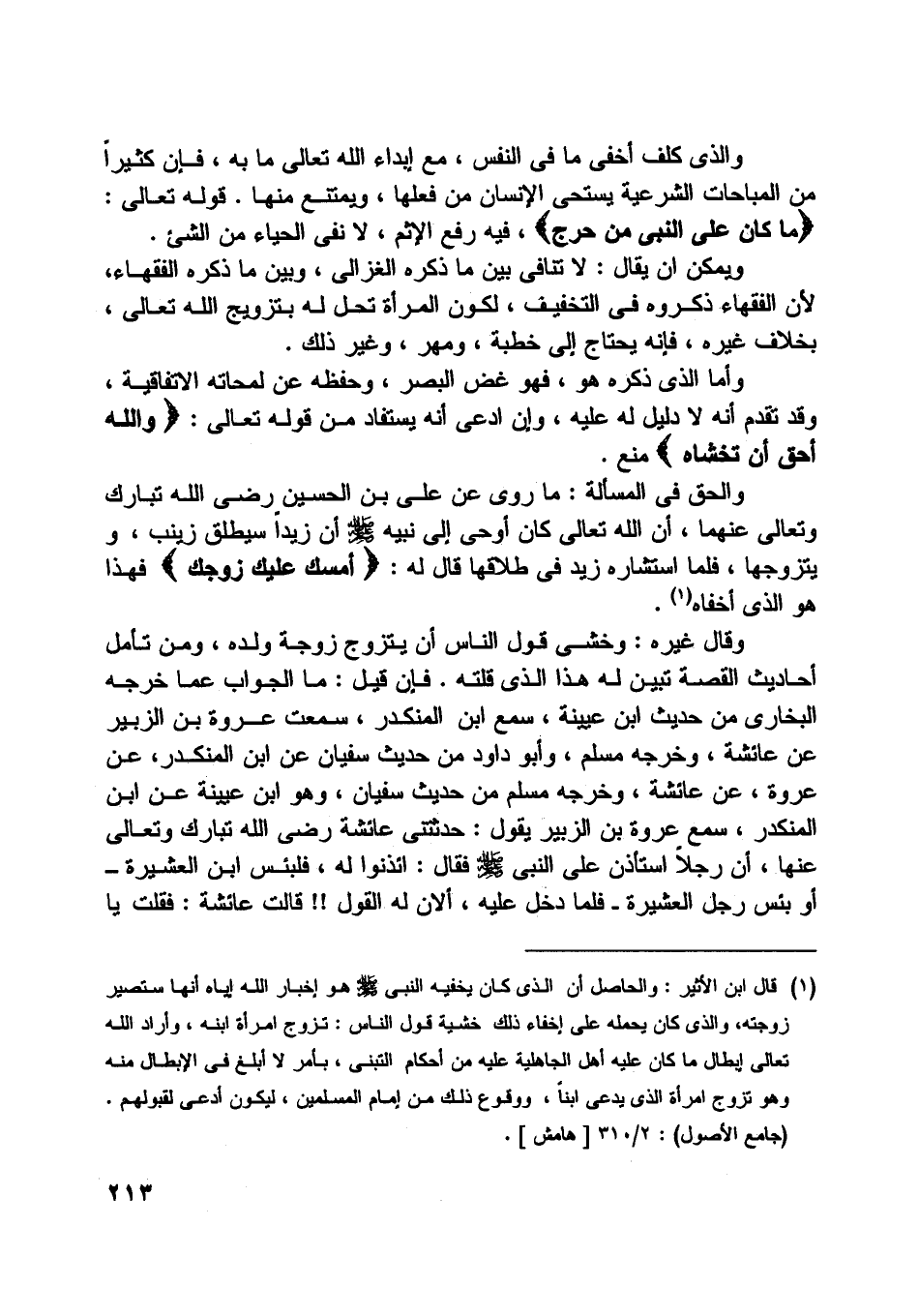 [ (1) ] قال ابن الأثير: والحاصل أن الّذي كان يخفيه النبي صلى اللَّه عليه وسلّم هو إخبار اللَّه إياه أنها ستصير زوجته، والّذي كان يحمله على إخفاء ذلك خشية قول الناس: تزوج امرأة ابنه، وأراد اللَّه تعالى إبطال ما كان عليه أهل الجاهلية عليه من أحكام التبني، بأمر لا أبلغ في الإبطال منه وهو تزوج امرأة الّذي يدعى ابنا، ووقوع ذلك من إمام المسلمين، ليكون أدعى لقبولهم.