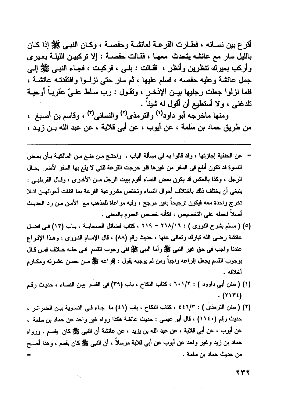 [ (5) ] (مسلم بشرح النووي) : 16/ 218- 219، كتاب فضائل الصحابة، باب (13) في فضل عائشة رضى اللَّه تبارك وتعالى عنها، حديث رقم (88) ، قال الإمام النووي: وهذا الإقراع عندنا واجب في حق غير النبي صلى اللَّه عليه وسلّم وأما النبي صلى اللَّه عليه وسلّم ففي وجوب القسم في حقه خلاف فمن قال بوجوب القسم يجعل إقراعه واجبا ومن لم يوجبه يقول: إقراعه صلى اللَّه عليه وسلّم من حسن عشرته ومكارم أخلاقه.