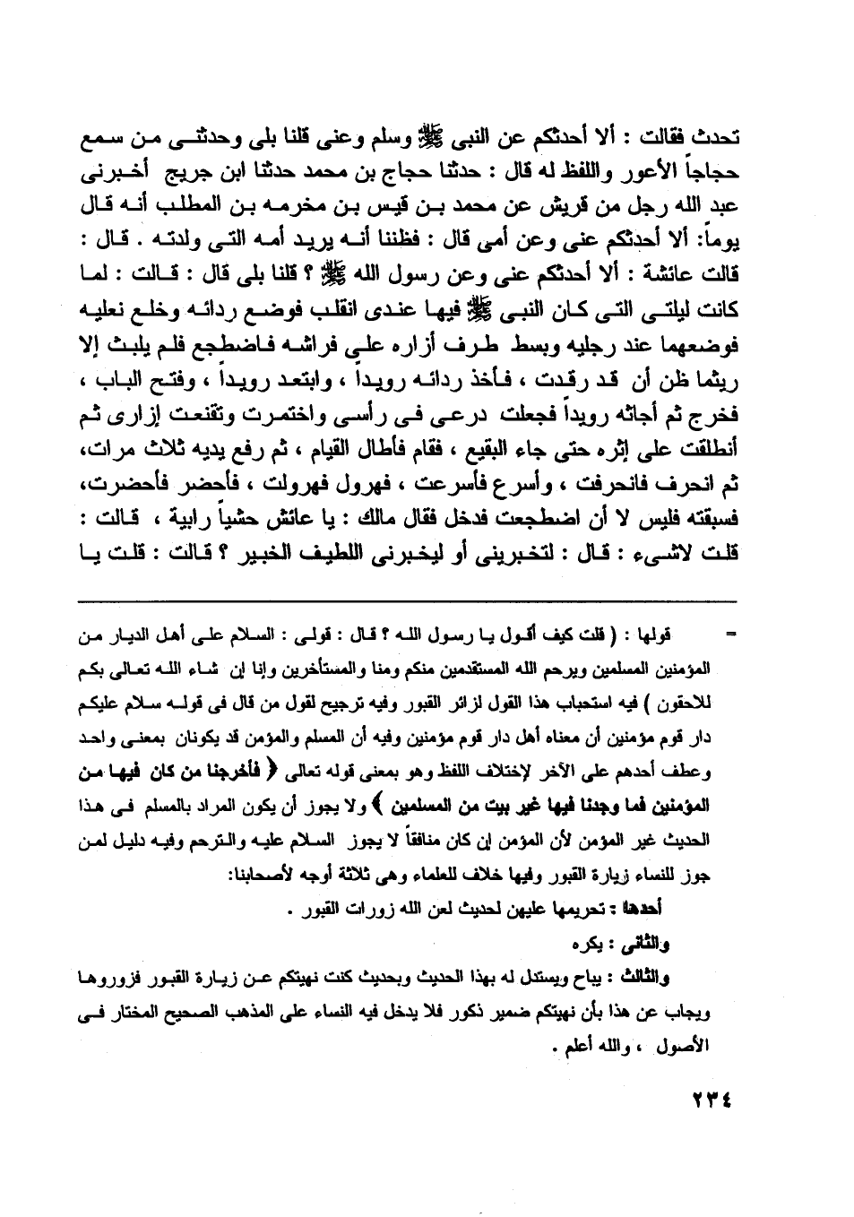 قالت عائشة: ألا أحدثكم عنى وعن رسول اللَّه صلى اللَّه عليه وسلّم؟ قلنا بلى قال: قالت: لما كانت ليلتي التي كان النبي صلى اللَّه عليه وسلّم فيها عندي انقلب فوضع ردائه وخلع نعليه فوضعهما عند رجليه وبسط طرف إزاره على فراشه فاضطجع فلم يلبث إلا ريثما ظن أن قد رقدت، فأخذ ردائه رويدا، وابتعد رويدا، وفتح الباب، فخرج ثم أجأثه رويدا فجعلت درعي في رأسي واختمرت وتقنعت إزاري ثم انطلقت على إثره حتى جاء البقيع، فقام فأطال القيام، ثم رفع يديه ثلاث مرات، ثم انحرف فانحرفت، وأسرع فأسرعت، فهرول فهرولت، فأحضر فأحضرت، فسبقته فليس لا أن اضطجعت فدخل فقال مالك: يا عائش حشيا رابية، قالت: