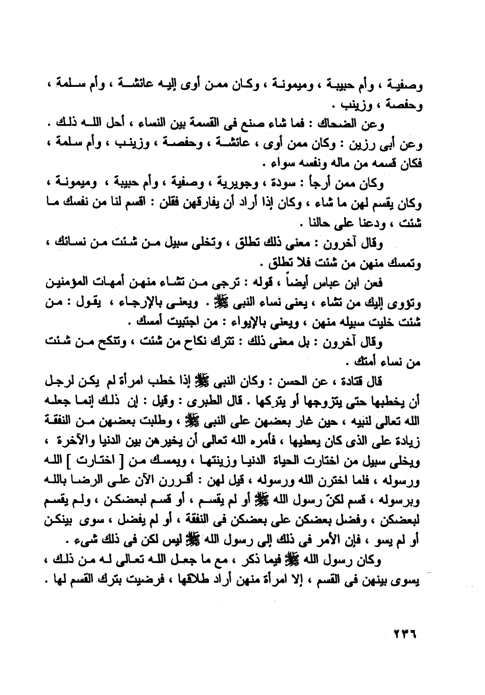 وكان رسول اللَّه صلى اللَّه عليه وسلّم فيما ذكر، مع ما جعل اللَّه تعالى له من ذلك، يسوى بينهن في القسم، إلا امرأة منهن أراد طلاقها، فرضيت بترك القسم لها.