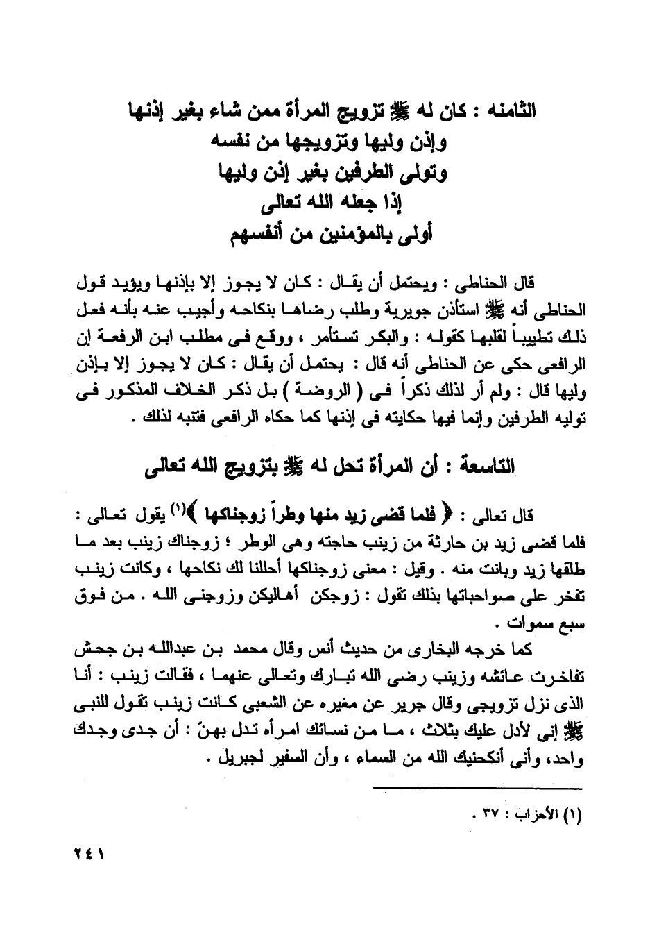 الثامنة: كان له صلى اللَّه عليه وسلّم تزويج المرأة ممن شاء بغير إذنها وإذن وليها وتزويجها من نفسه وتولى الطرفين بغير إذن وليها إذا جعله اللَّه تعالى أولى بالمؤمنين من أنفسهم