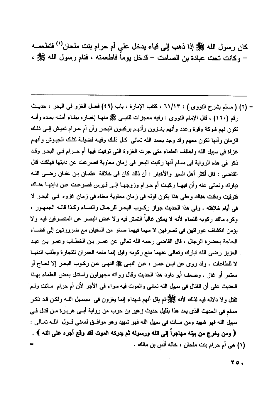 [ () ] (2) (مسلم بشرح النووي) : 13/ 61، كتاب الإمارة، باب (49) فضل الغزو في البحر، حديث رقم (160) ، قال الإمام النووي: وفيه معجزات للنّبيّ صلى اللَّه عليه وسلّم منها إخباره ببقاء أمته بعده وأنه تكون لهم شوكة وقوة وعدد وأنهم يغزون وأنهم يركبون البحر وأن أم حرام تعيش إلى ذلك الزمان وأنها تكون معهم وقد وجد بحمد اللَّه تعالى كل ذلك وفيه فضيلة لتلك الجيوش وأنهم غزاة في سبيل اللَّه واختلف العلماء متى جرت الغزوة التي توفيت فيها أم حرام في البحر وقد ذكر في هذه الرواية في مسلم أنها ركبت البحر في زمان معاوية فصرعت عن دابتها فهلكت قال القاضي: قال أكثر أهل السير والأخبار: أن ذلك كان في خلافة عثمان بن عفان رضى اللَّه تبارك وتعالى عنه وأن فيها ركبت أم حرام وزوجها إلى قيرس فصرعت عن دايتها هناك فتوفيت ودفنت هناك وعلى هذا يكون قوله في زمان معاوية معناه في زمان غزوة في البحر لا في أيام خلافته. وفي هذا الحديث جواز ركوب البحر للرجال والنساء كذا قاله الجمهور، وكره مالك ركوبه للنساء لأنه لا يمكن غالبا التستر فيه ولا غض البصر عن المتصرفين فيه ولا يؤمن انكشاف عوراتهن في تصرفهن لا سيما فيهما صغر من السفيان مع ضرورتهن إلى قضاء الحاجة بحضرة الرجال، قال القاضي رحمه اللَّه تعالى عن عمر بن الخطاب وعمر بن عبد العزيز رضى اللَّه تبارك وتعالى عنهما منع ركوبه وقيل إنما منعه العمران للتجارة وطلب الدنيا لا للطاعات. وقد روى عن ابن عمر، عن النبي صلى اللَّه عليه وسلّم النهى عن ركوب البحر إلا لحاج أو معتمر أو غاز. وضعف أبو داود هذا الحديث وقال رواته مجهولون واستدل بعض العلماء بهذا الحديث على أن القتال في سبيل اللَّه تعالى والموت فيه سواء في الأجر لأن أم حرام ماتت ولم تقتل ولا دلالة فيه لذلك لأنه صلى اللَّه عليه وسلّم لم يقل أنهم شهداء إنما يغزون في سبيل اللَّه ولكن قد ذكر مسلم في الحديث الّذي بعد هذا بقليل حديث زهير بن حرب من رواية أبى هريرة من قتل في سبيل اللَّه فهو شهيد ومن مات في سبيل اللَّه فهو شهيد وهو موافق لمعنى قول اللَّه تعالى: