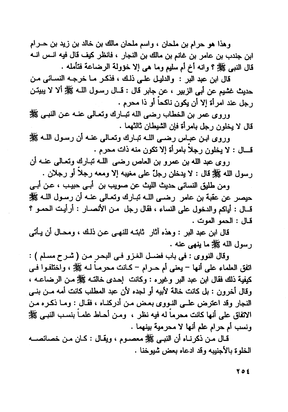 قال ابن عبد البر: والدليل على ذلك، فذكر ما خرجه النسائي من حديث غشيم عن أبى الزبير، عن جابر قال: قال رسول اللَّه صلى اللَّه عليه وسلّم ألا لا يبيتن رجل عند امرأة إلا أن يكون ناكحا أو ذا محرم.