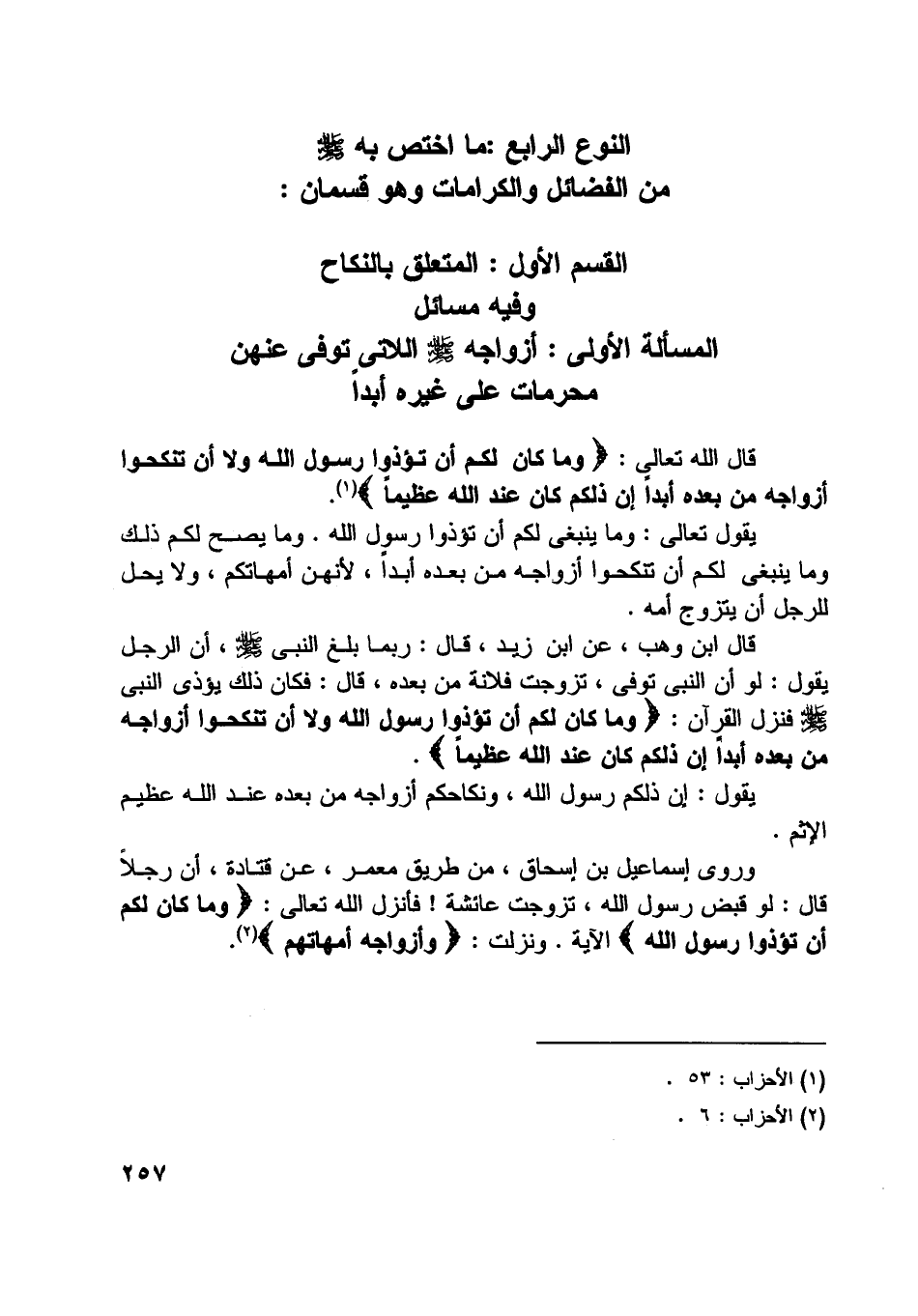 قال اللَّه تعالى: وَما كانَ لَكُمْ أَنْ تُؤْذُوا رَسُولَ اللَّهِ وَلا أَنْ تَنْكِحُوا أَزْواجَهُ مِنْ بَعْدِهِ أَبَداً إِنَّ ذلِكُمْ كانَ عِنْدَ اللَّهِ عَظِيماً [ (1) ] .