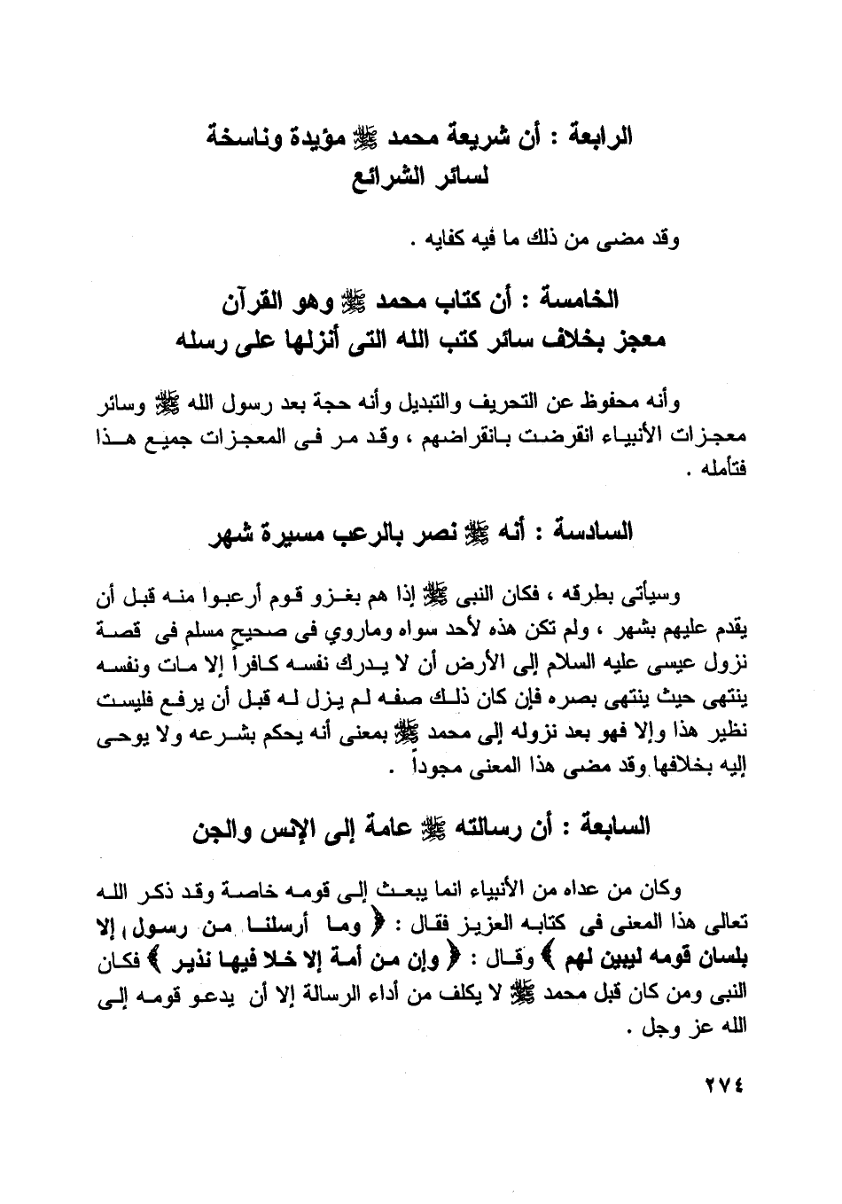الرابعة: أن شريعة محمد صلى اللَّه عليه وسلّم مؤيدة وناسخة لسائر الشرائع