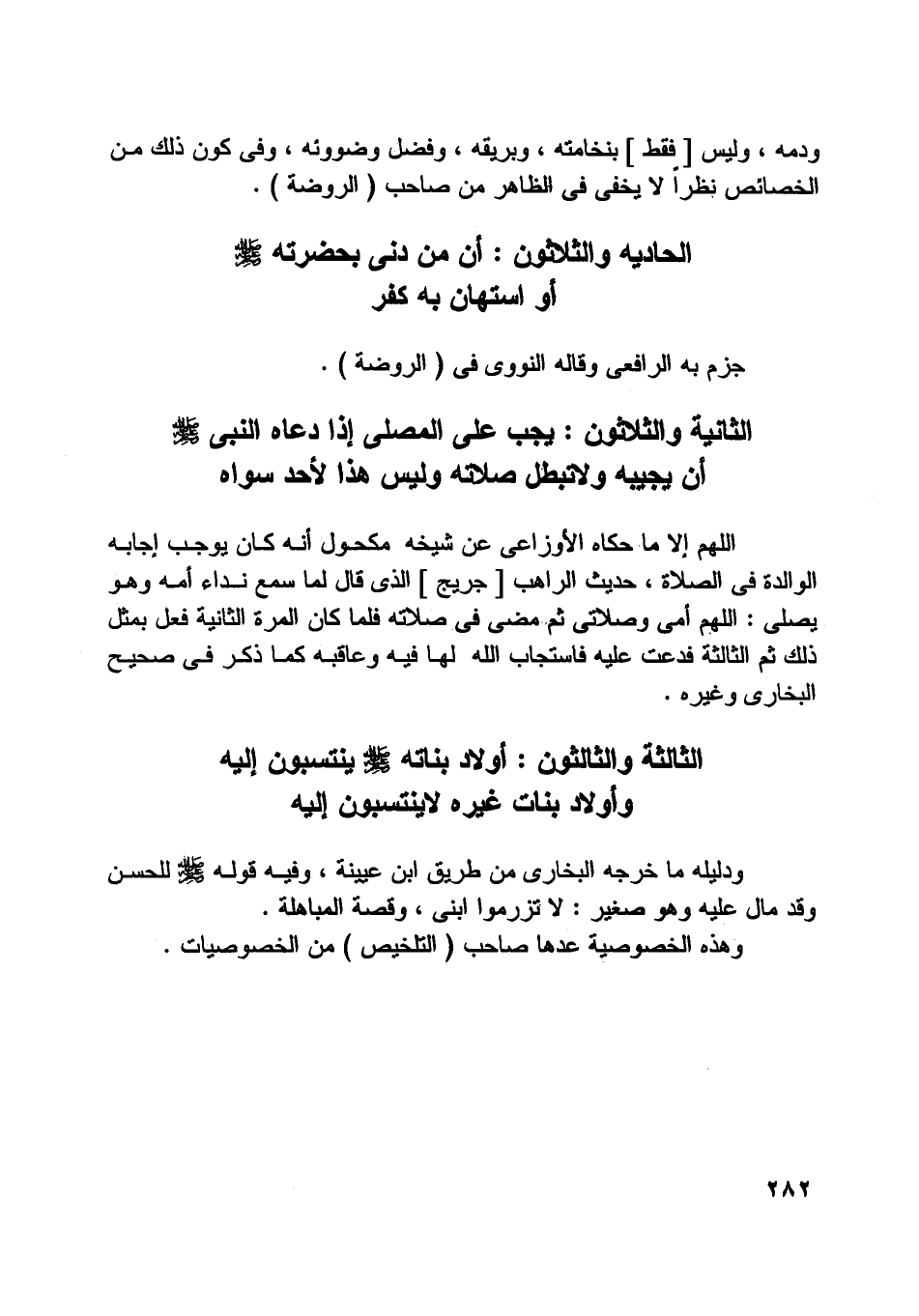 ودمه، وليس [فقط] بنخامته، وبريقه، وفضل وضوئه، وفي كون ذلك من الخصائص نظرا لا يخفى في الظاهر من صاحب (الروضة) .